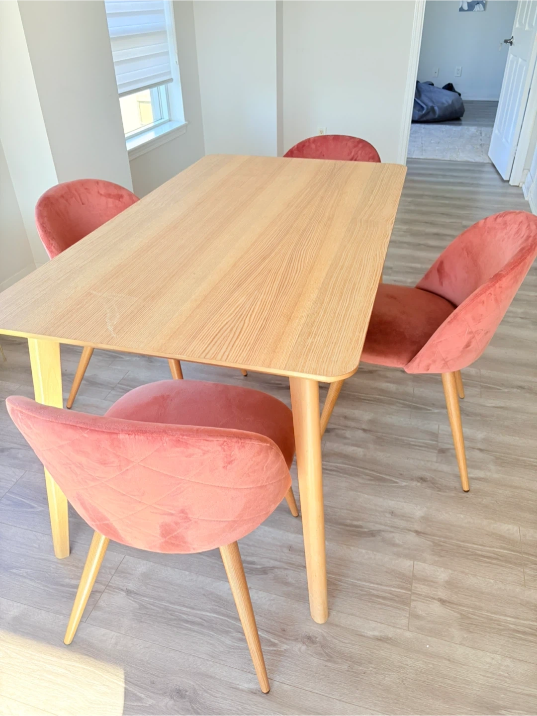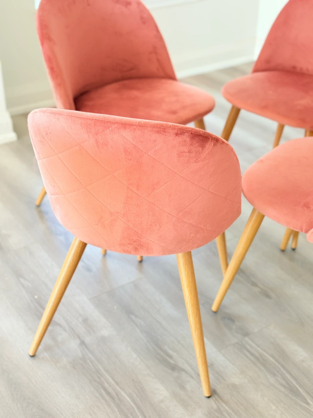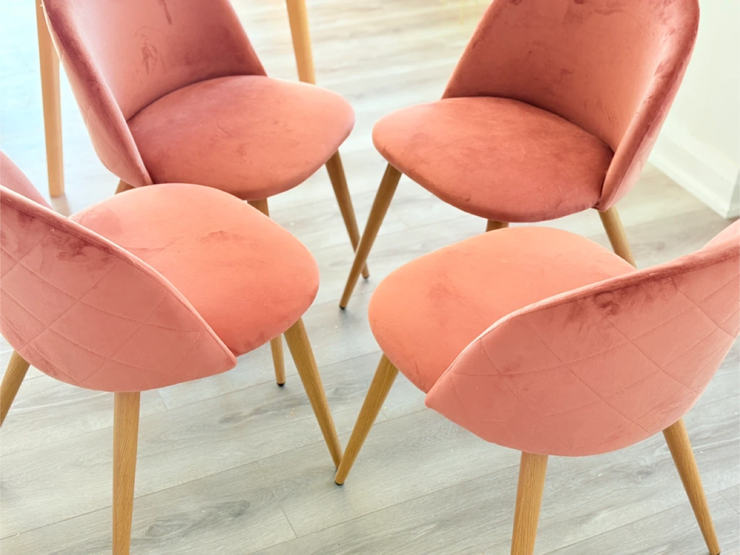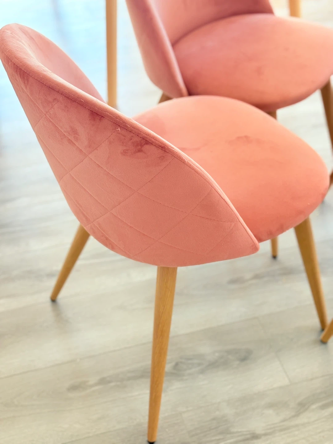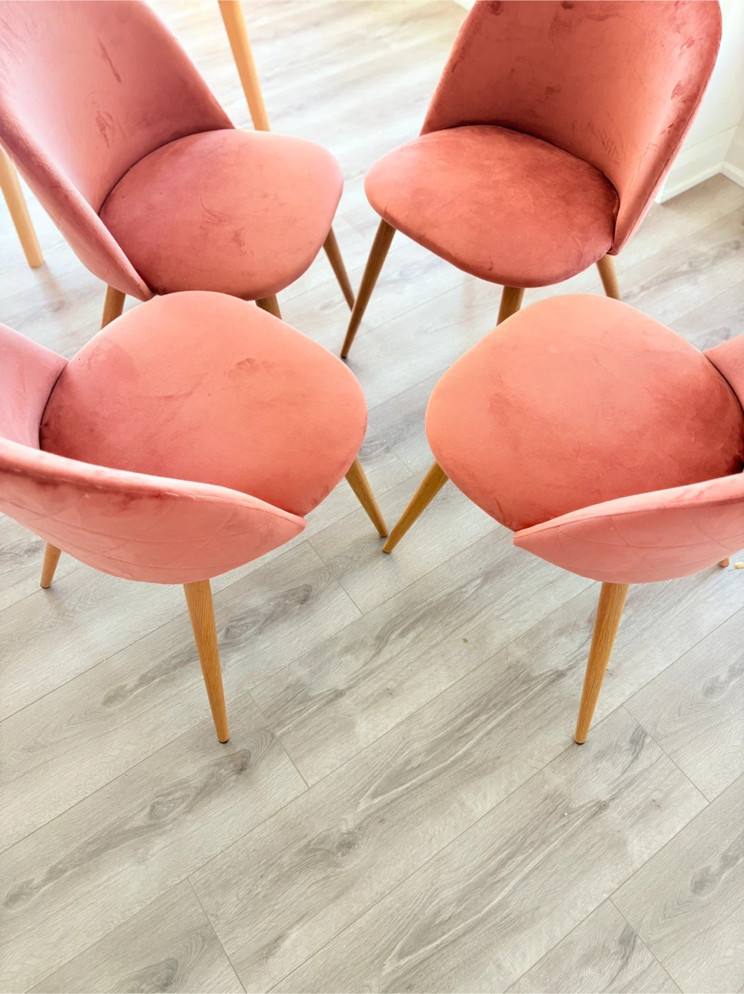I paid 400 for pair of chairs !Selling a set of four lovely pink velvet dining chairs! They're in great shape and would add a touch of charm to any dining space. The velvet material is soft and the colour is a beautiful, warm pink. The wooden legs complement the overall design perfectly! **** If you buy table (120) too it has discounted together for 350