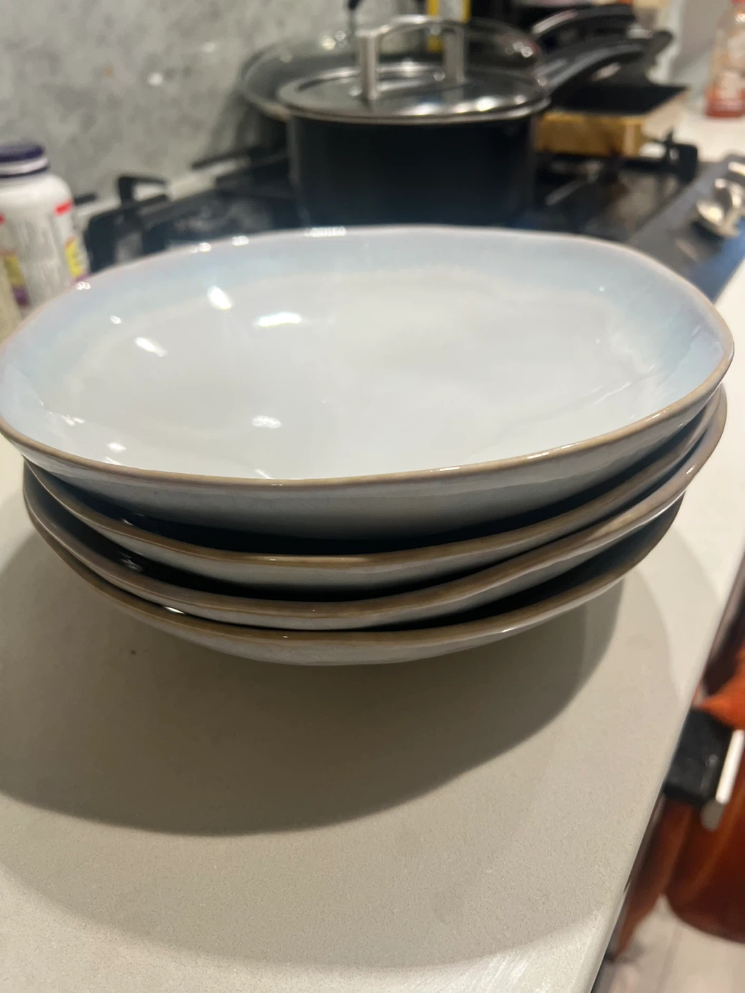 31Selling a set of 4 dinner plates! They are white with a light blue and green rim and curved edges. Great for everyday use or special occasions. Originally bought for 32 each. Selling all 4 for 50.