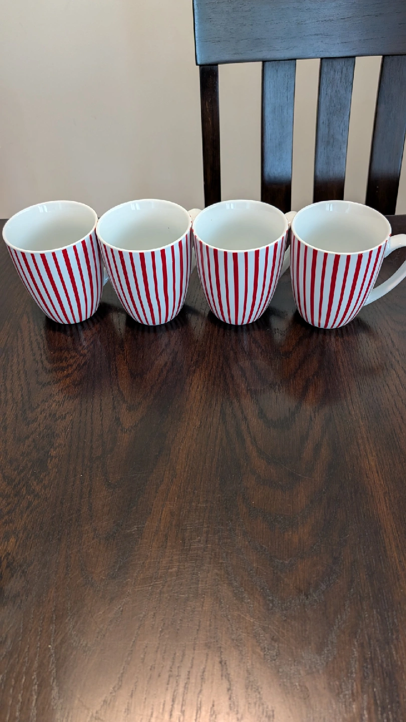 10Here's a set of four mugs, perfect for coffee or tea! They feature a fun red and white striped design that would brighten up any kitchen