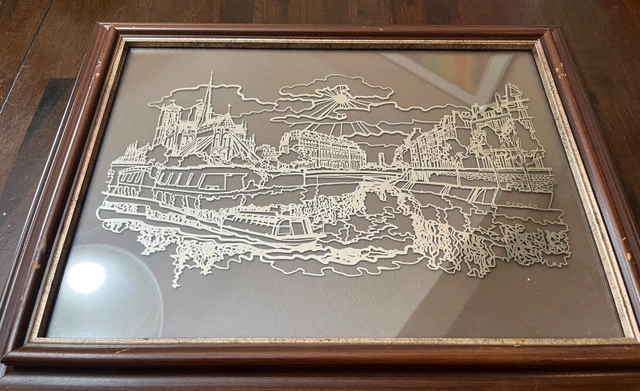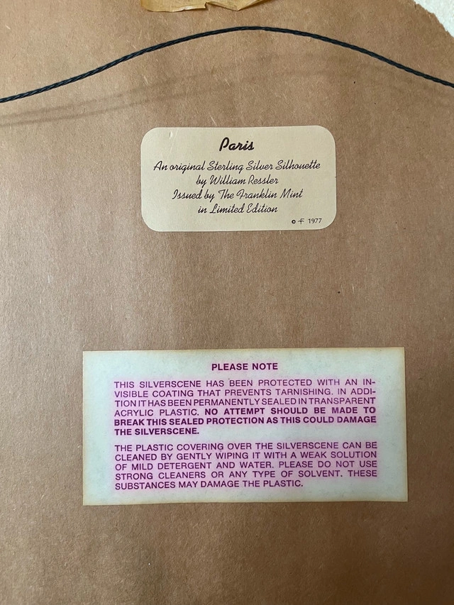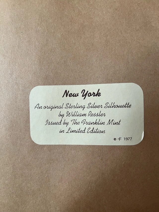 I'm offering a set of 4 vintage Franklin Mint sterling silver silhouettes by William Ressler, issued in a limited edition in 1977. These pieces depict New York, London, Rome and Paris. Each silhouette is intricately crafted and framed, showcasing iconic cityscapes. These are used items. Unfortunately the dust covers/backing paper were cut. * Artist: William Ressler * Issuer: The Franklin Mint * Year: 1977 * Material: Sterling Silver * Subject: New York, Paris, Rome, and London If the ad is up, the set is available! Please check out my other ads.