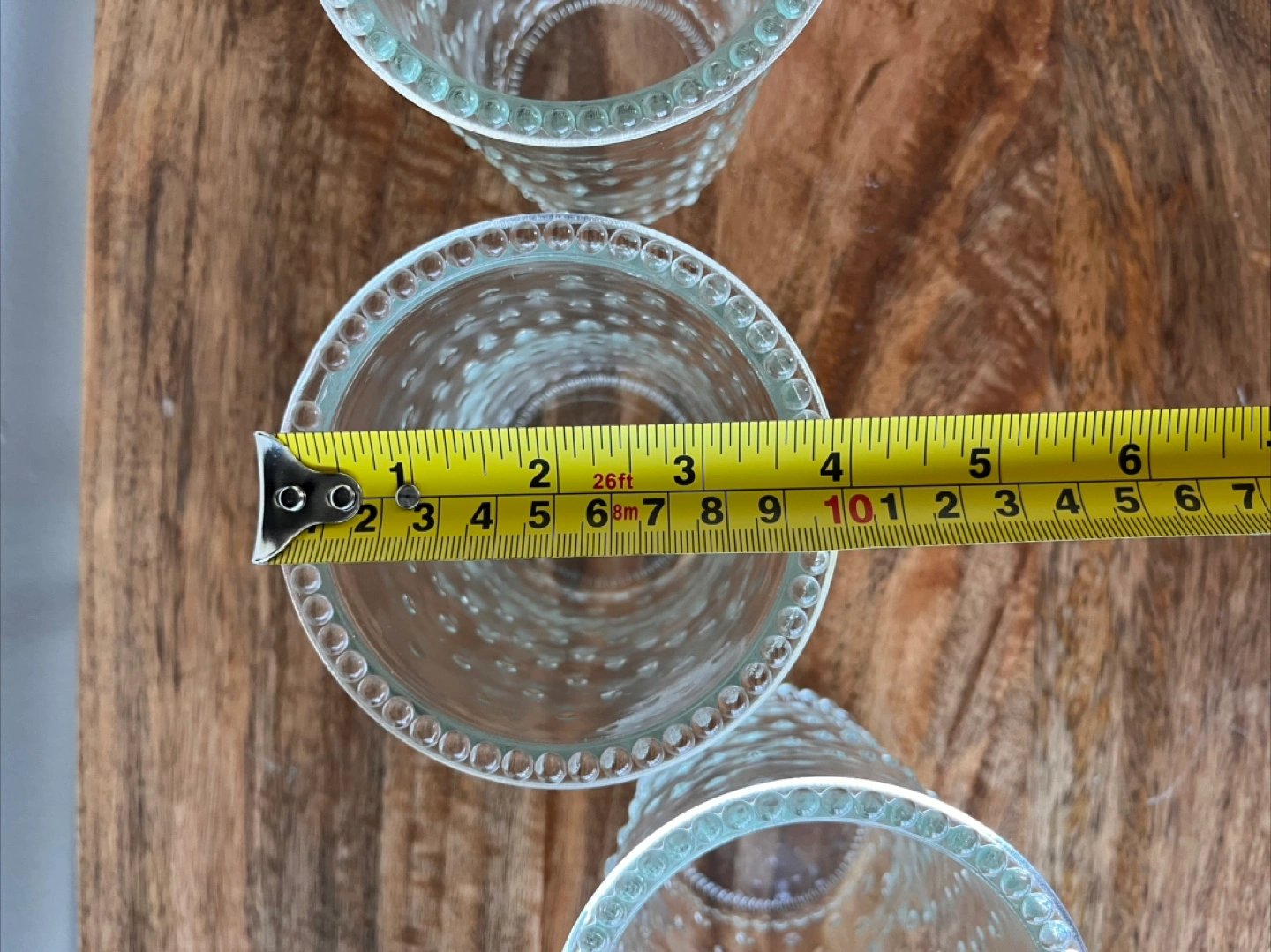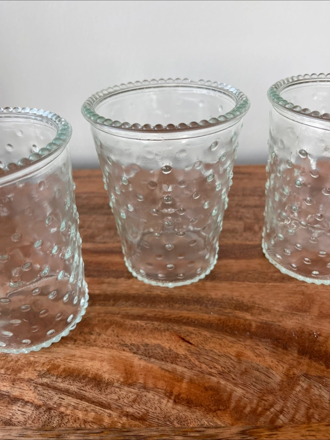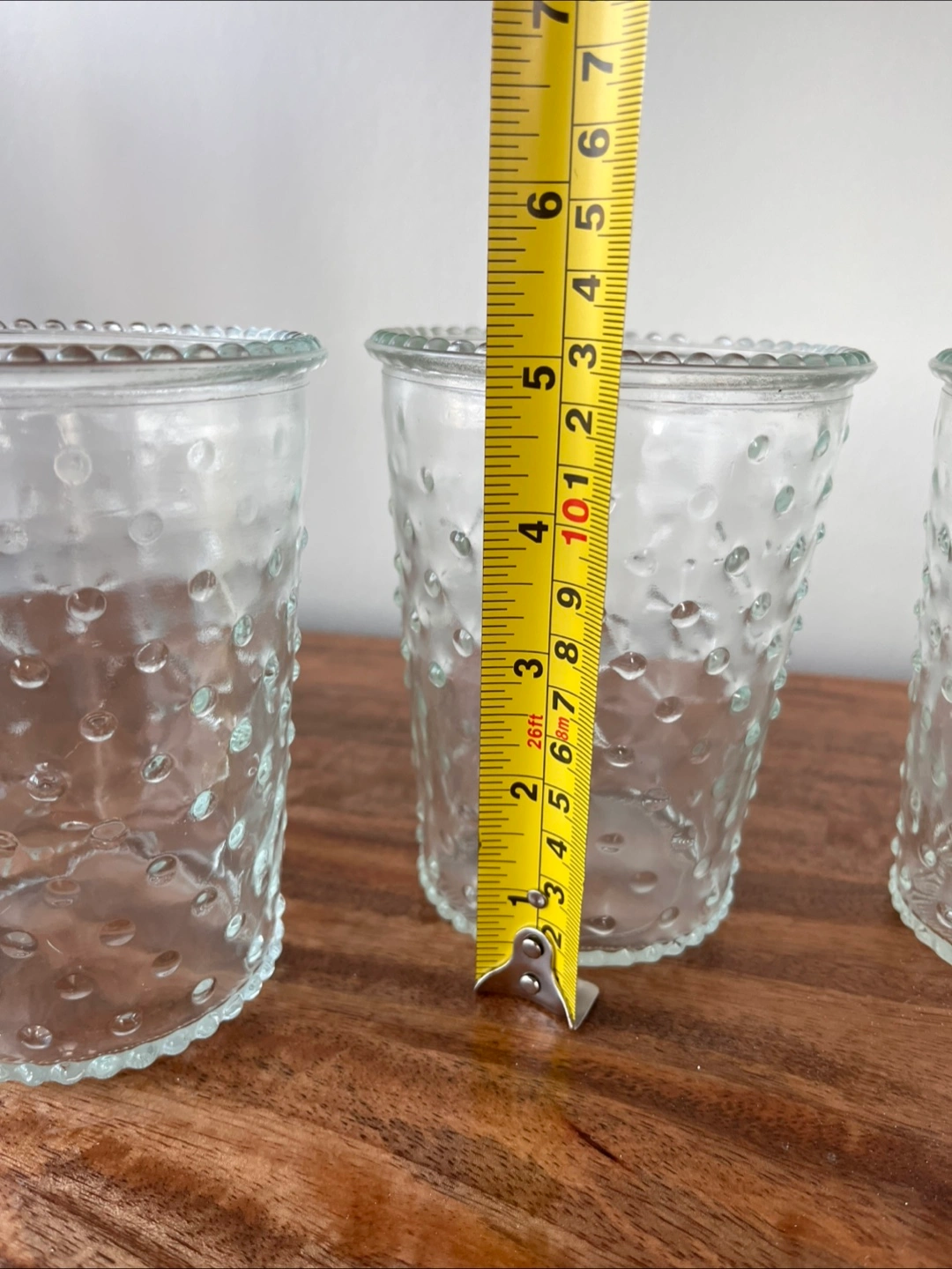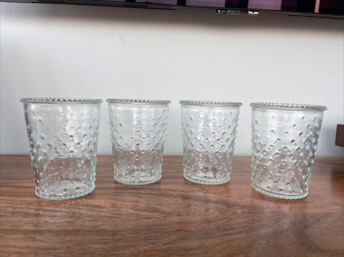 Selling a set of four clear vases or candle holders. They have a lovely textured design. Each glass is approximately 4 inches tall and 3 inches in diameter. Perfect for adding a touch of charm to your home!