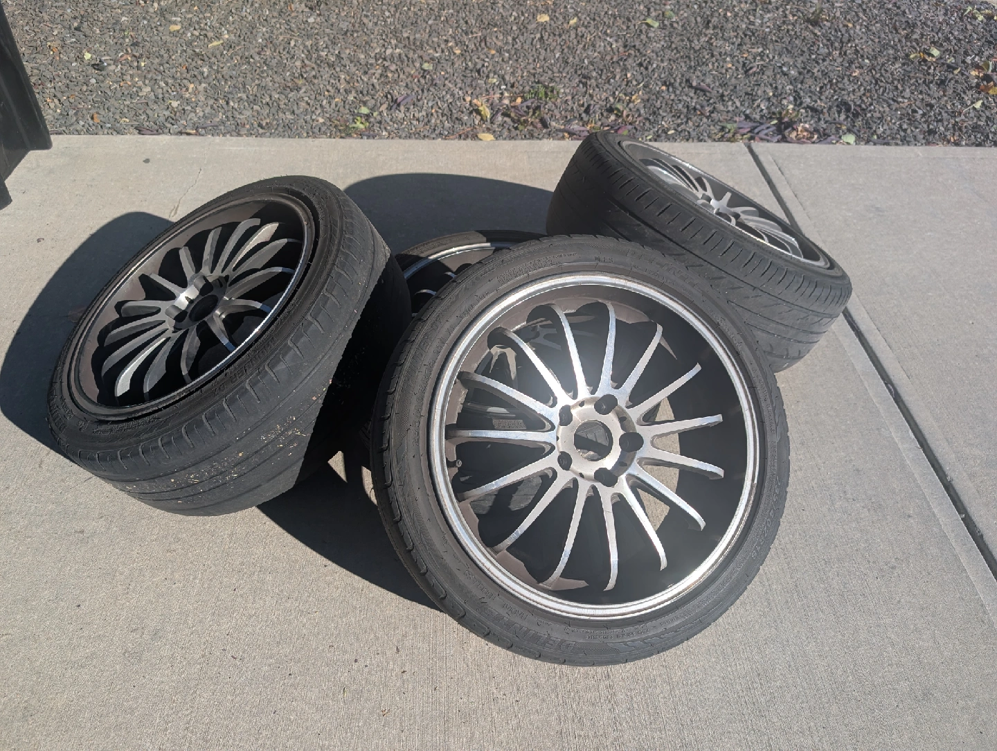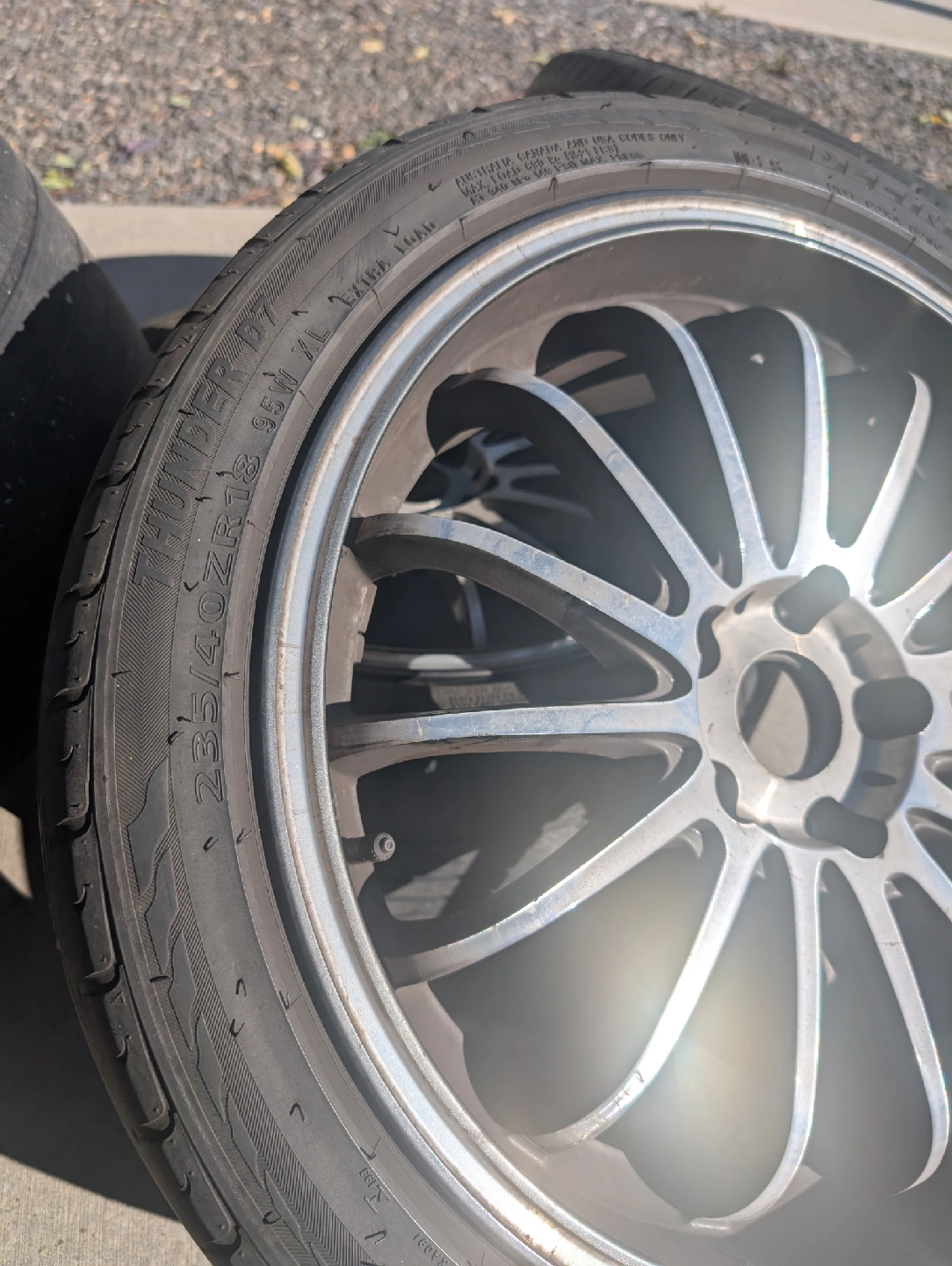 5Selling a set of four alloy wheels with Delinte Thunder D7 Mach 1 Radial tires. The size is 235/40ZR18. They are in used condition, so please see the photos for details.