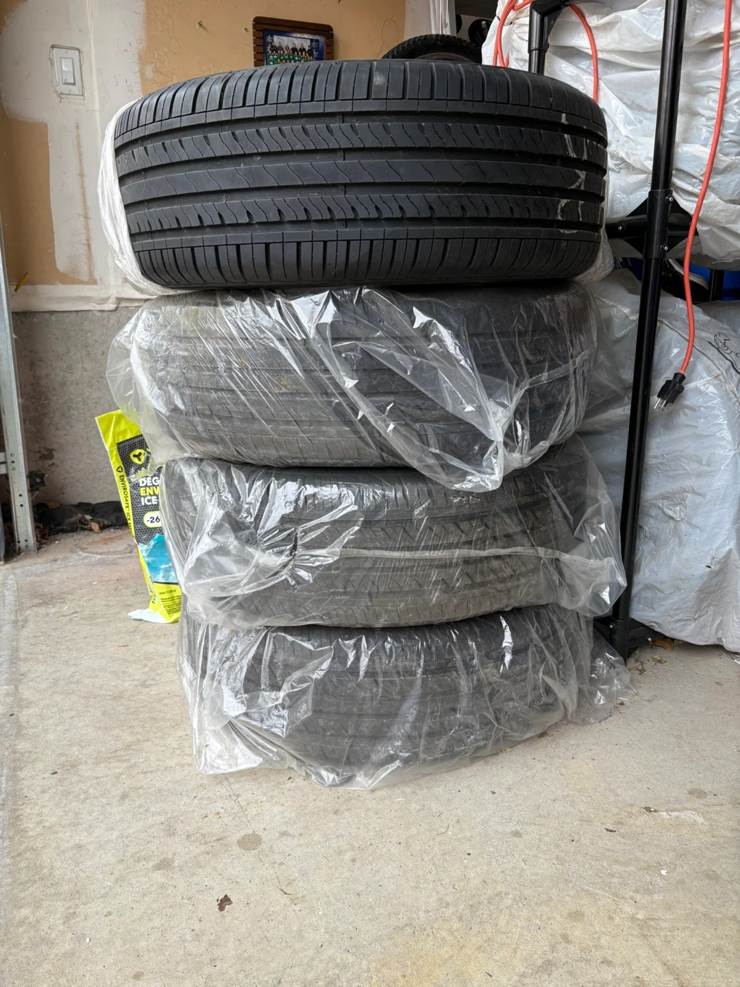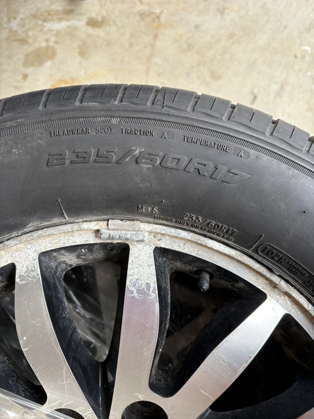10Selling a set of four tires, size 235/60R17. With rims Was for Kia mini van They're in good condition and ready to be put on your vehicle. Perfect for all-season driving!
