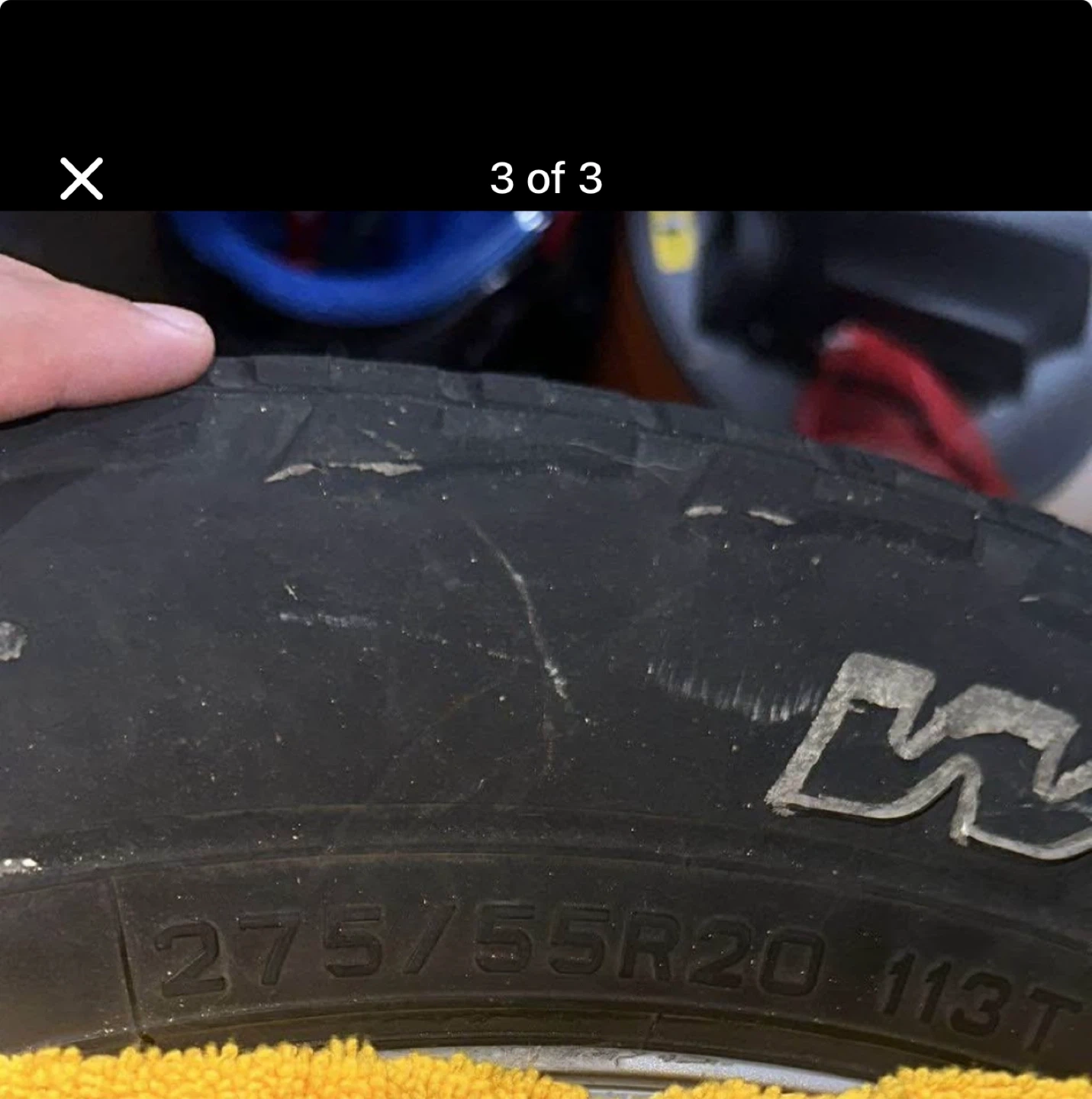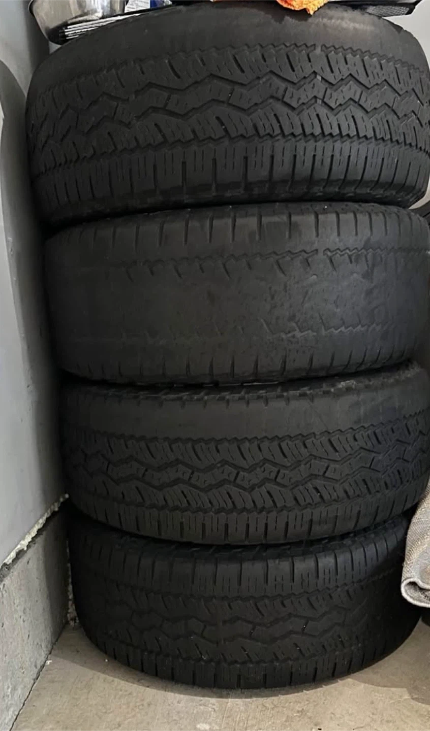 Selling a set of four used tires, size 275/55R20. They show signs of wear, as pictured, but still have some remaining life. Three are in really good condition; only one appears quite used. Rims included.