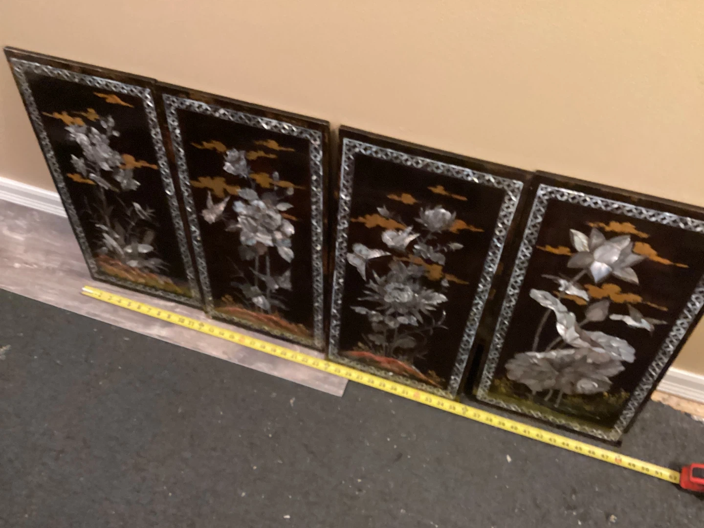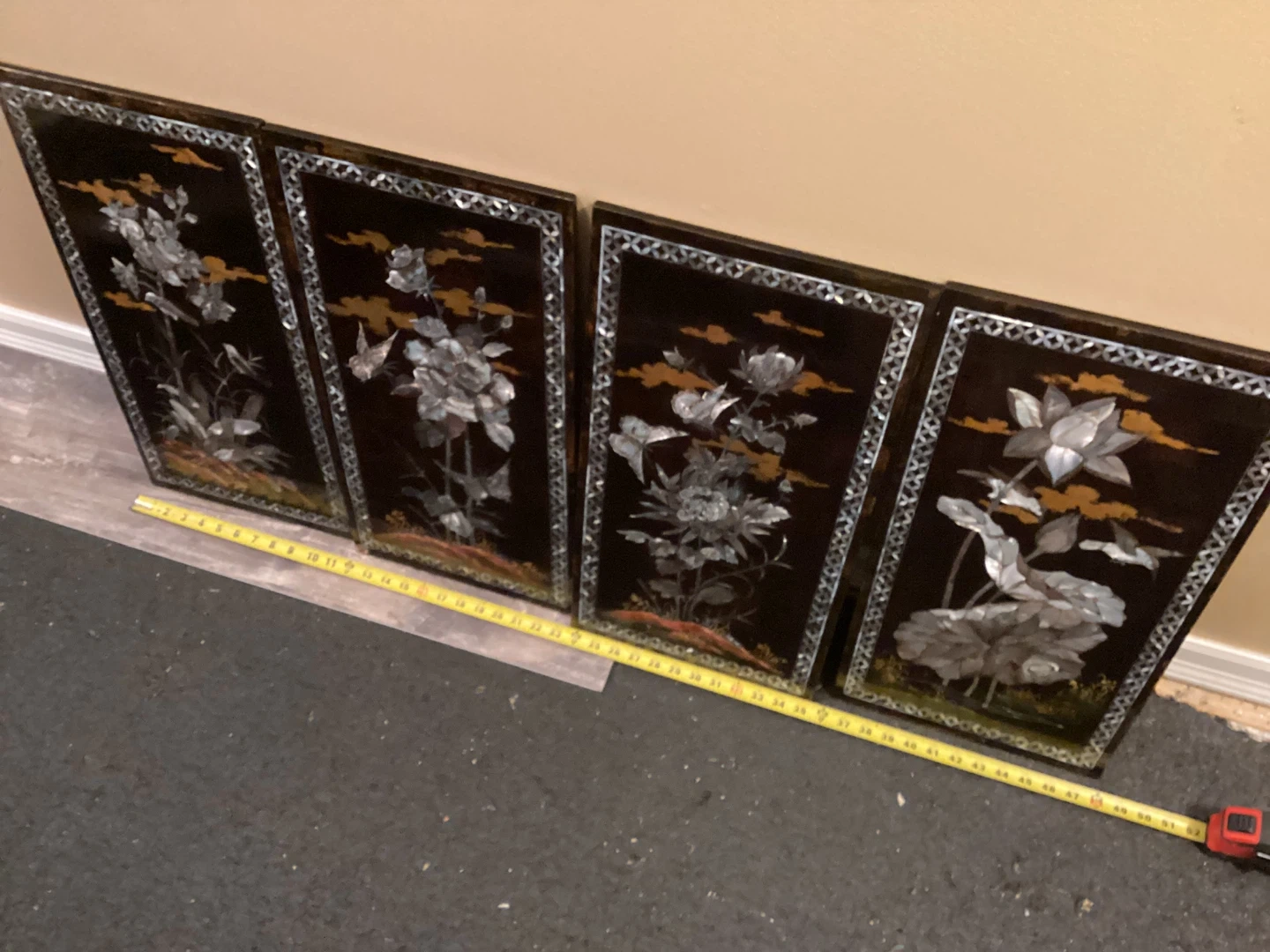 Selling a set of four Asian-inspired wall art panels. They feature a dark background with intricate floral and nature scenes inlaid with what appears to be mother-of-pearl or a similar iridescent material. These panels would add a touch of elegance to any room! Direct from Vietnam.