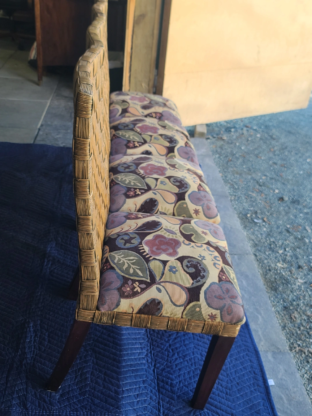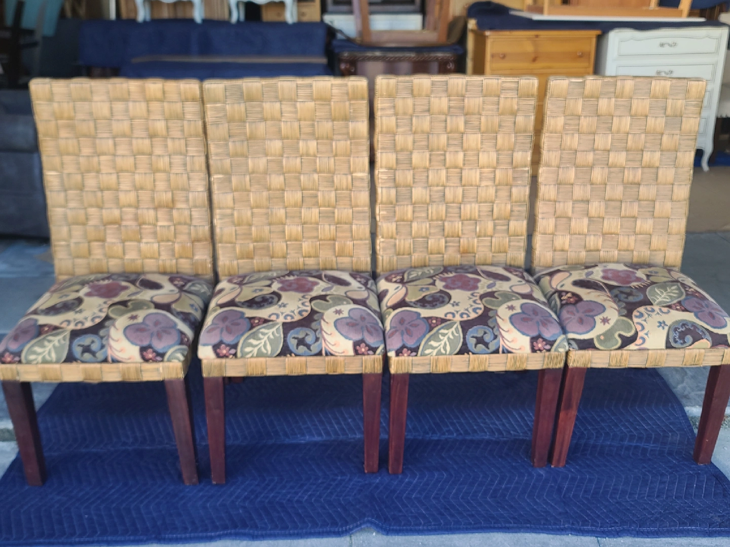 60A set of four dining chairs! They feature a woven back and a floral patterned seat. The legs are a dark brown colour. They'd be perfect for adding a touch of texture to your dining space! Measurements to follow. Delivery can be arranged. Viewing and pickup by appointment.