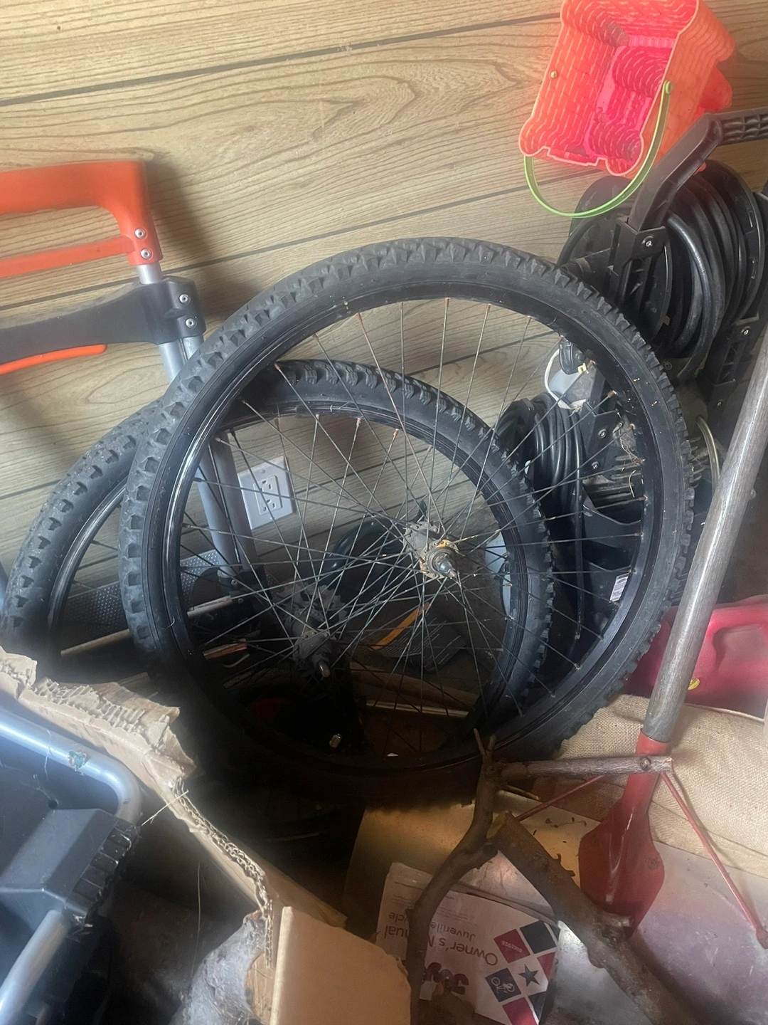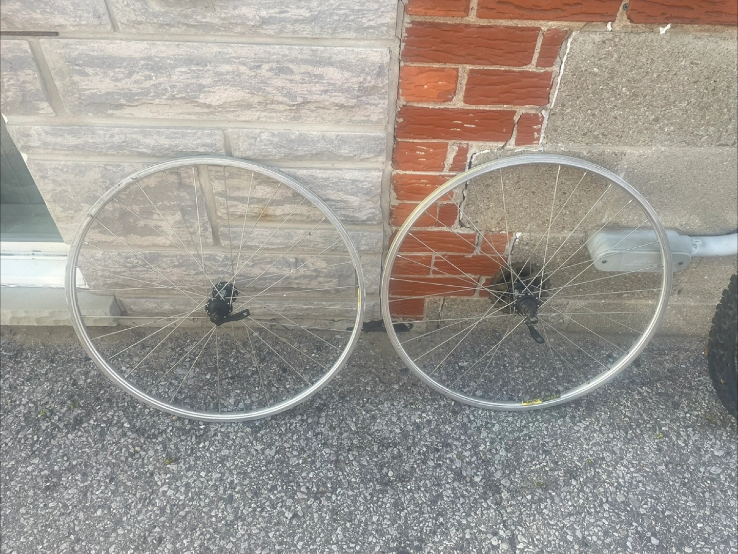 Six bicycle wheels for sale. Two sets of road bike wheels and one set of mountain bike wheels. Various sizes. Good for repairs or parts.