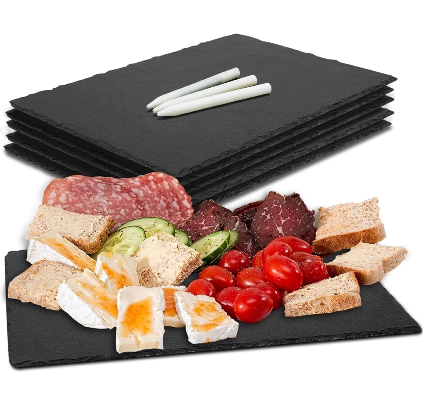 1000+Six rectangular slate serving boards. Perfect for cheese, charcuterie, or appetizers. Includes small chalk markers.