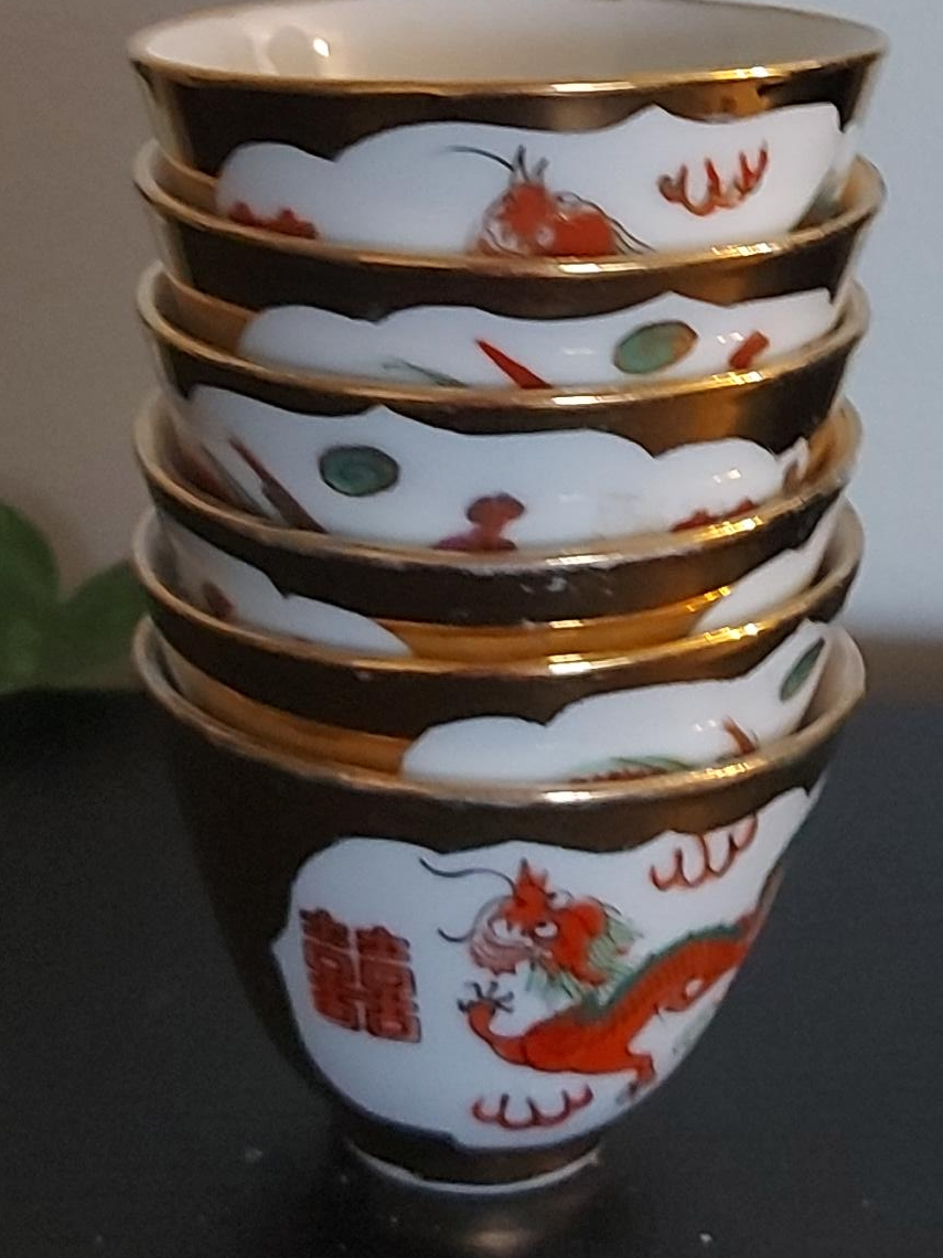 Here's a set of six delicate Chinese tea cups. They feature a dragon design with gold trim and say "Made in China" on the bottom. Perfect for adding a touch of elegance to your tea time