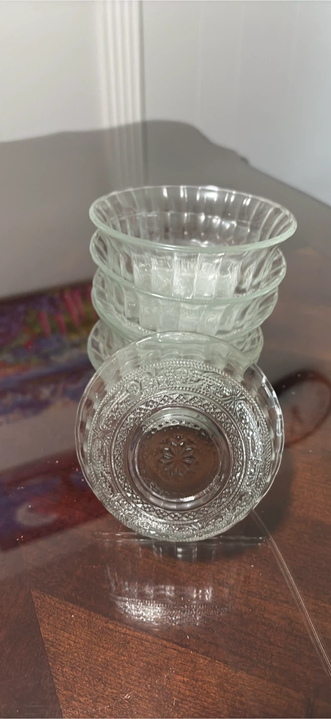 62Selling a set of 6 clear glass dessert bowls. They have a lovely decorative pattern on the bottom. Perfect for serving desserts or snacks!