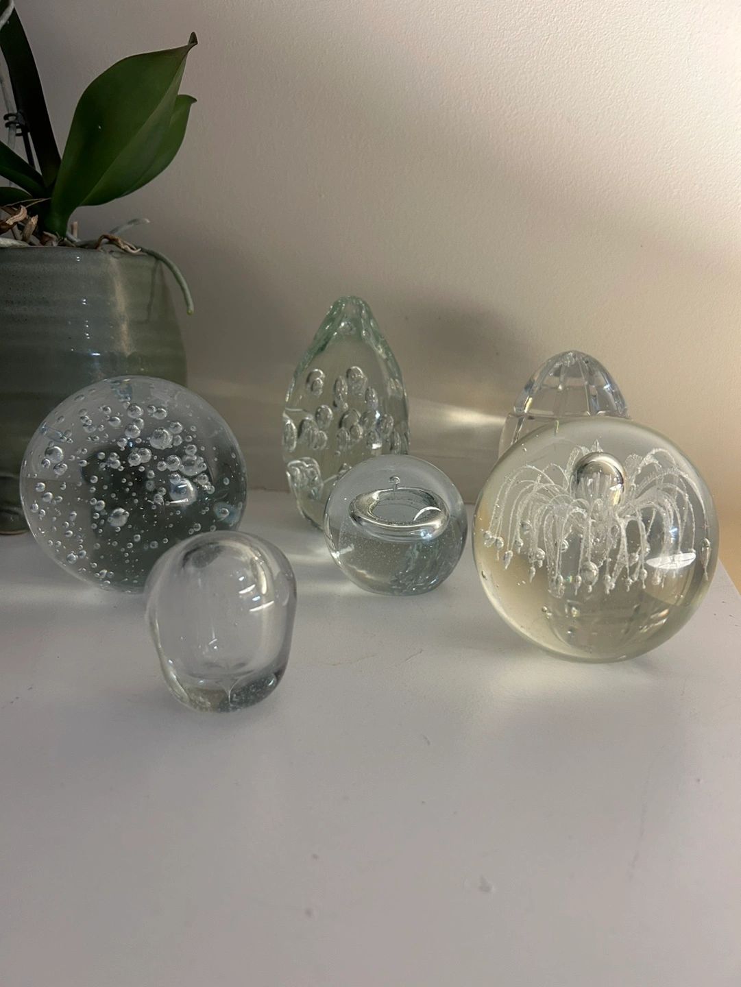 10Set of 6 glass vintage paperweights. Various shapes, sizes and designs. Some have bubbles, others are clear.