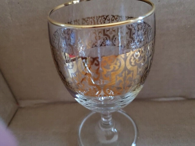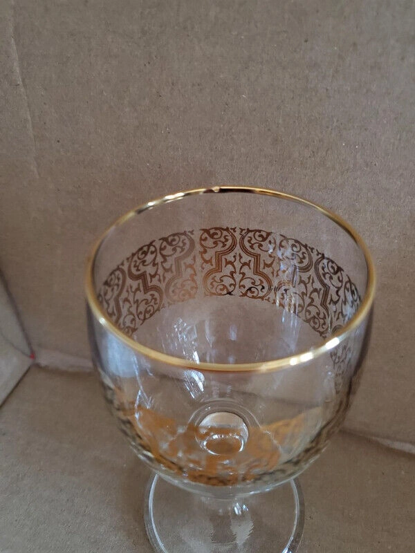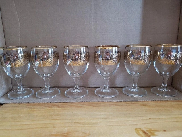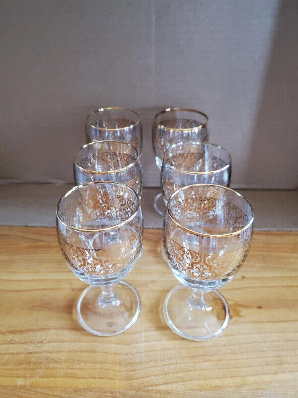 0Lovely set of 6 gold design small glasses. Mid-century modern design, the gold rims and patterns are intact and vibrant without worn spots. Really good vintage condition. Dimensions: 2.5" across, 4.5" high (5.5cm x 11.5cm). $20.00 for the set of six, pick up only.