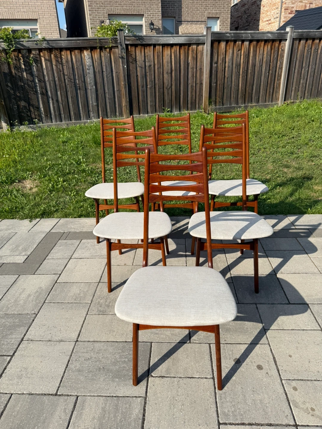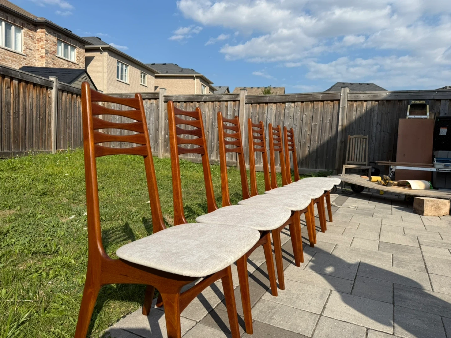 Selling a set of six Teak mid-century modern dining chairs. They have a beautiful wood frame and neutral-toned fabric seats. These chairs would look great in any dining room or kitchen!