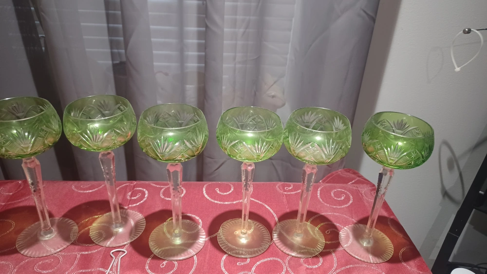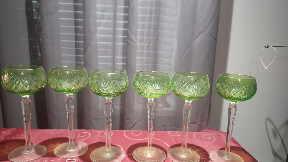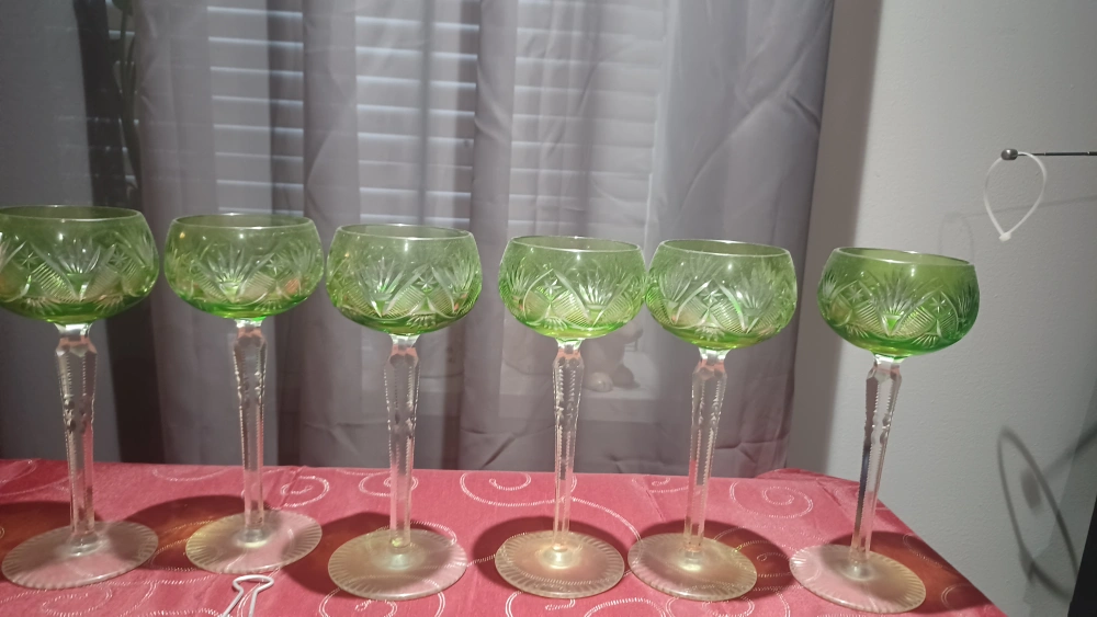 68Selling a set of 6 vintage green crystal wine glasses. These glasses have a beautiful cut crystal design and a delicate stem. Perfect for adding a touch of elegance to your table!
