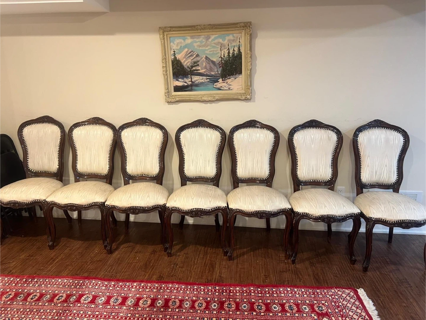 10I'm selling a set of 7 antique dining chairs. They feature a dark wood frame and cream coloured upholstery. Please note that one of the chairs has some damage to the underside of the seat.