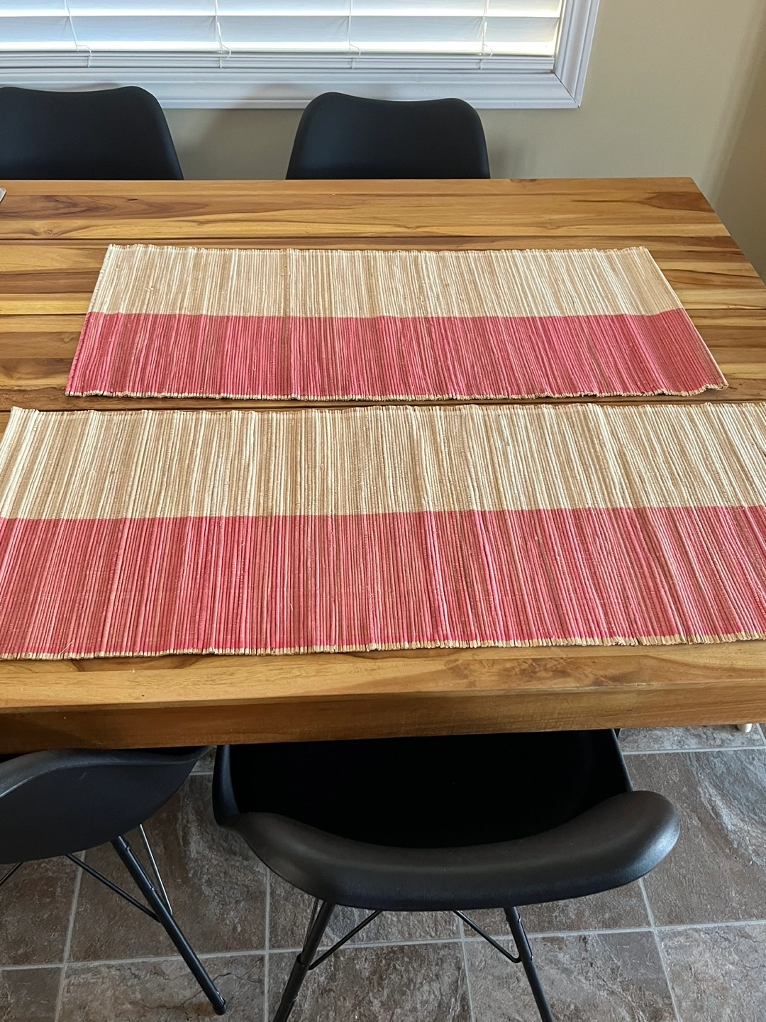 Set of 8 placemats and 2 runners.Pink and natural colours. Made of bamboo.