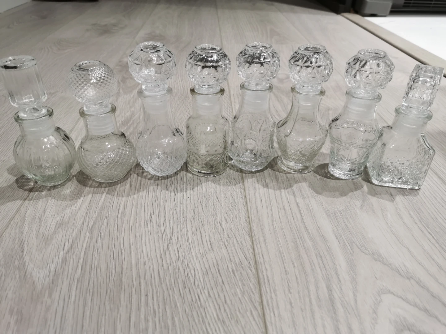 65Selling a set of nine decorative glass bottles! They are clear glass with decorative stoppers. Perfect for adding a touch of elegance to any room. Coming from a dog friendly, no smoking household