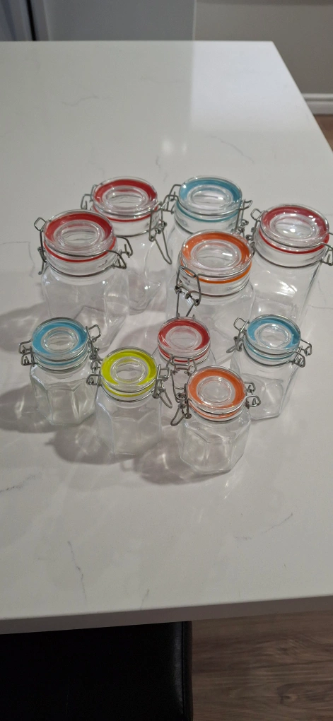 15Selling a set of 9 cute glass jars! They come in various sizes and have colourful lids (red, blue, orange, yellow). Great for storing spices, herbs, or small snacks in your kitchen or pantry