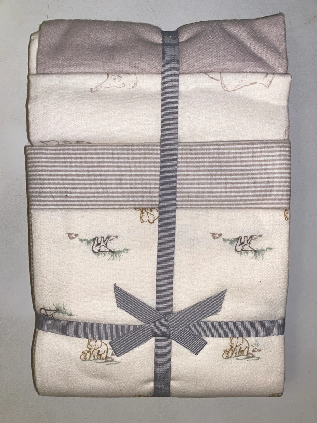 222Selling a cute baby blanket set featuring an adorable elephant print. The set includes a few different blanket designs and textures, all bundled together with a grey ribbon. Perfect for keeping your little one cozy and warm!