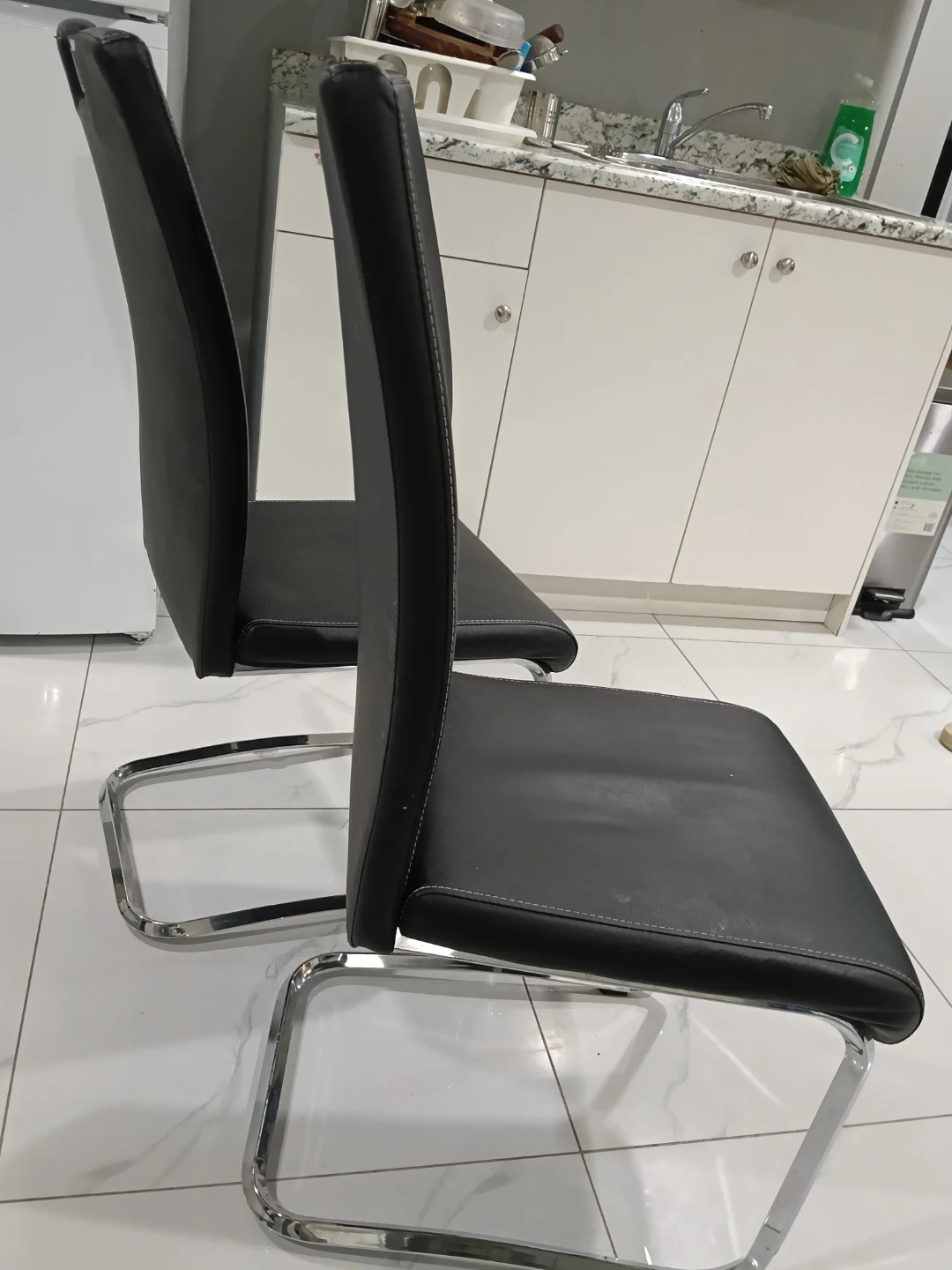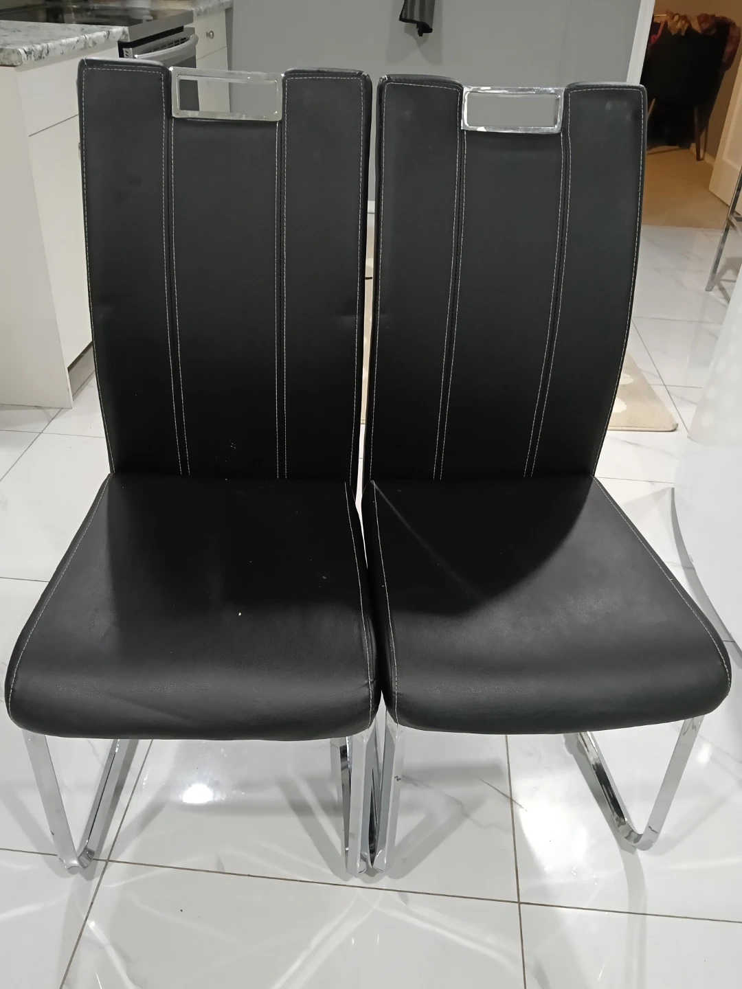 5Selling a set of four sleek black dining chairs! They're in great shape and would look fantastic in any modern dining space. The chairs feature a minimalist design with a high back and chrome legs, adding a touch of elegance to your home. Perfect for everyday meals or entertaining guests