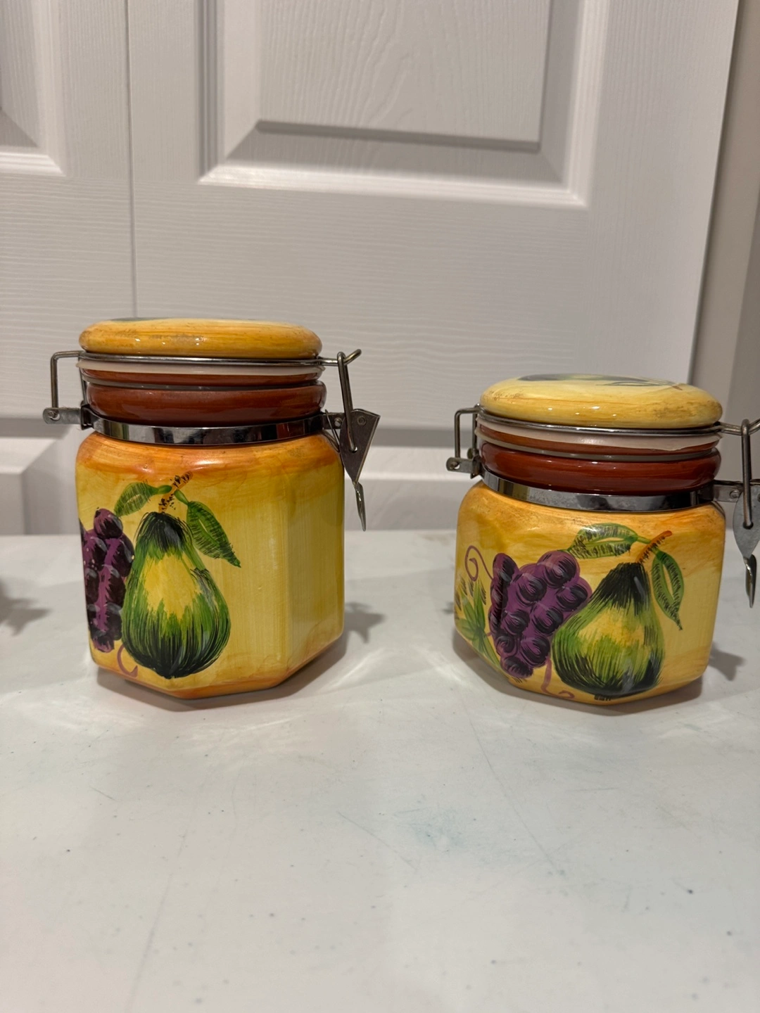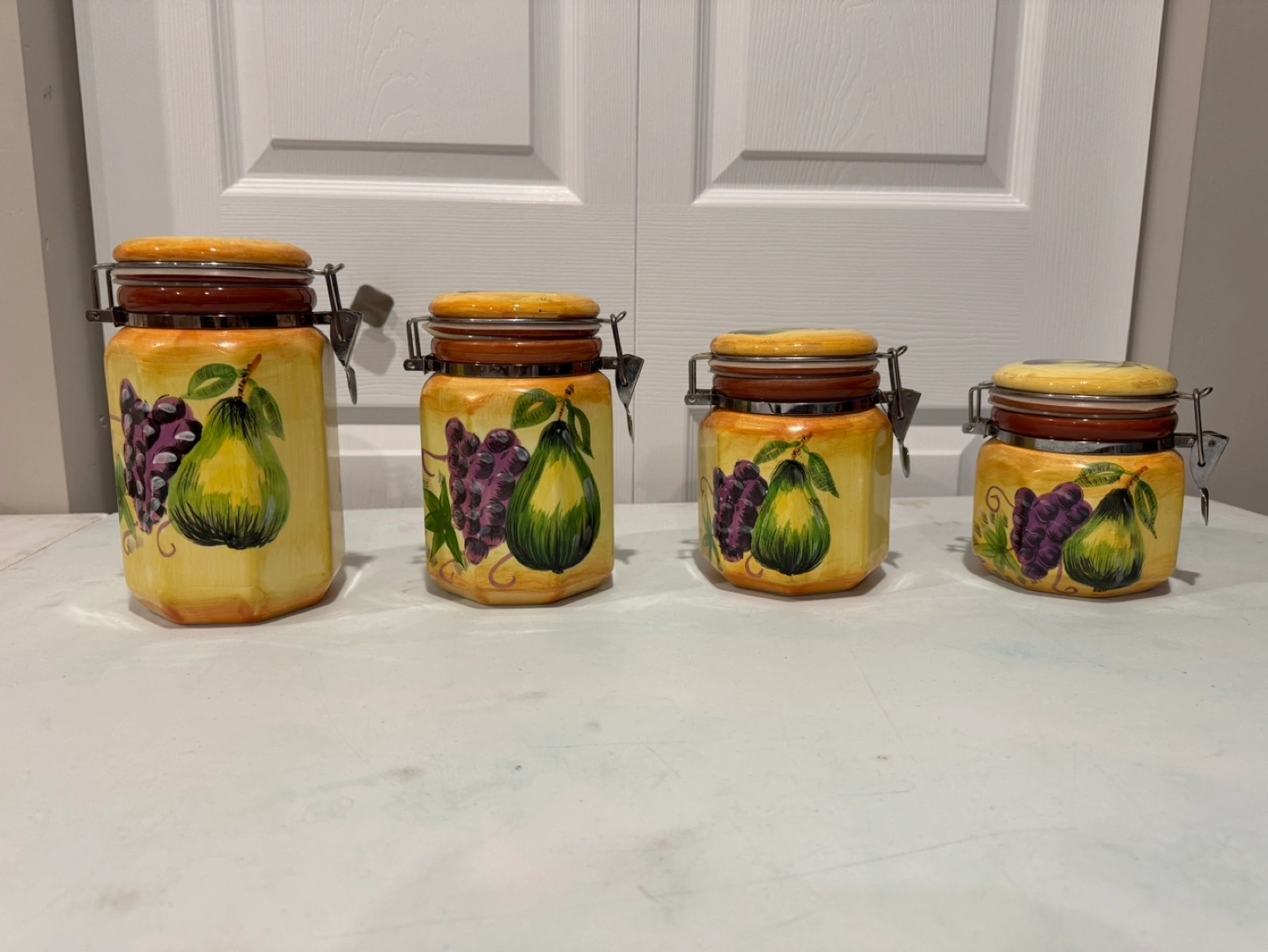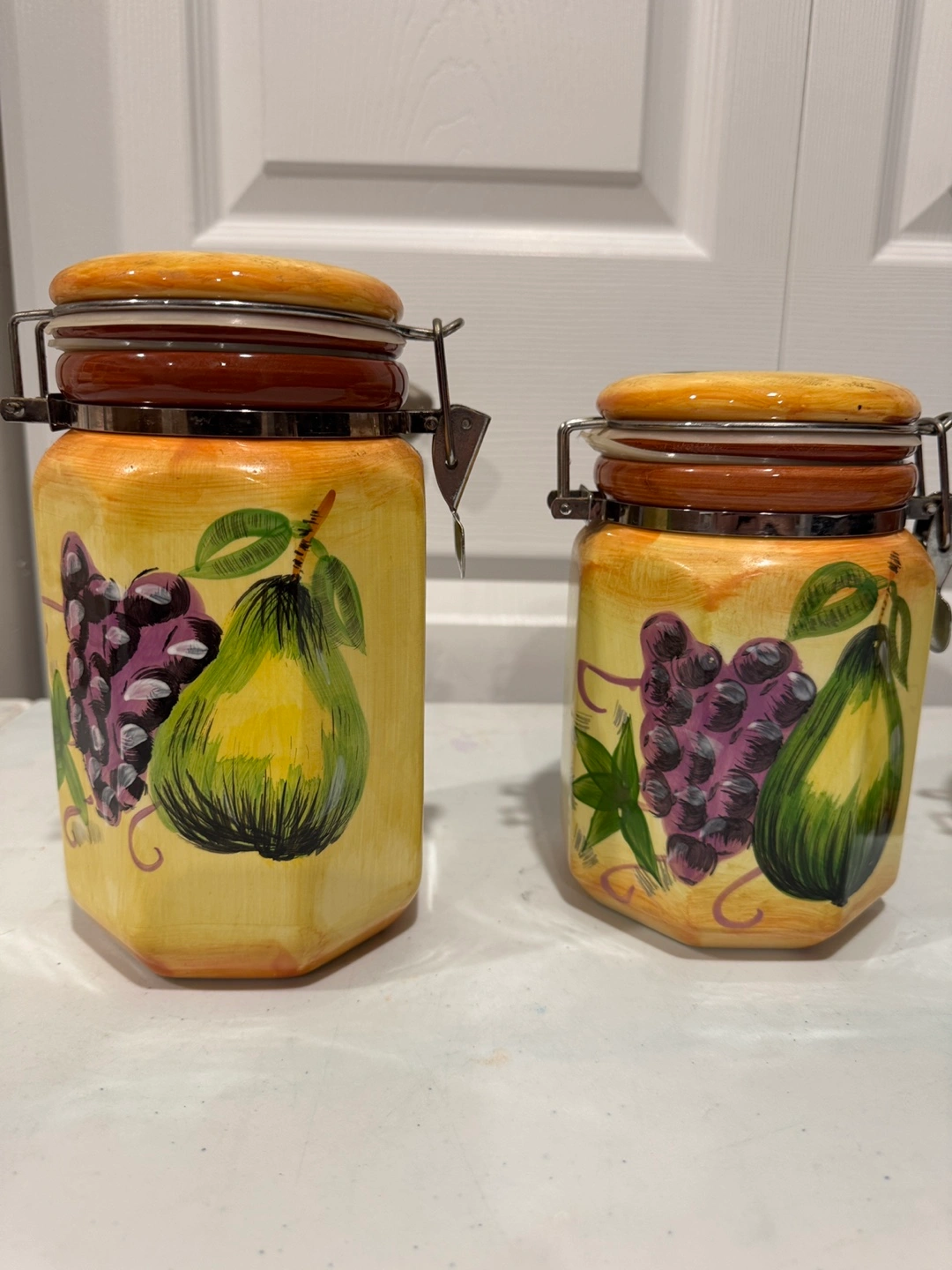 Four ceramic canisters, various sizes. Octagonal shape. Feature hand-painted design of pears and grapes. Metal clasp closures. Perfect for kitchen storage. Selling for $40 Located in st adolphe but can meet in south end of city