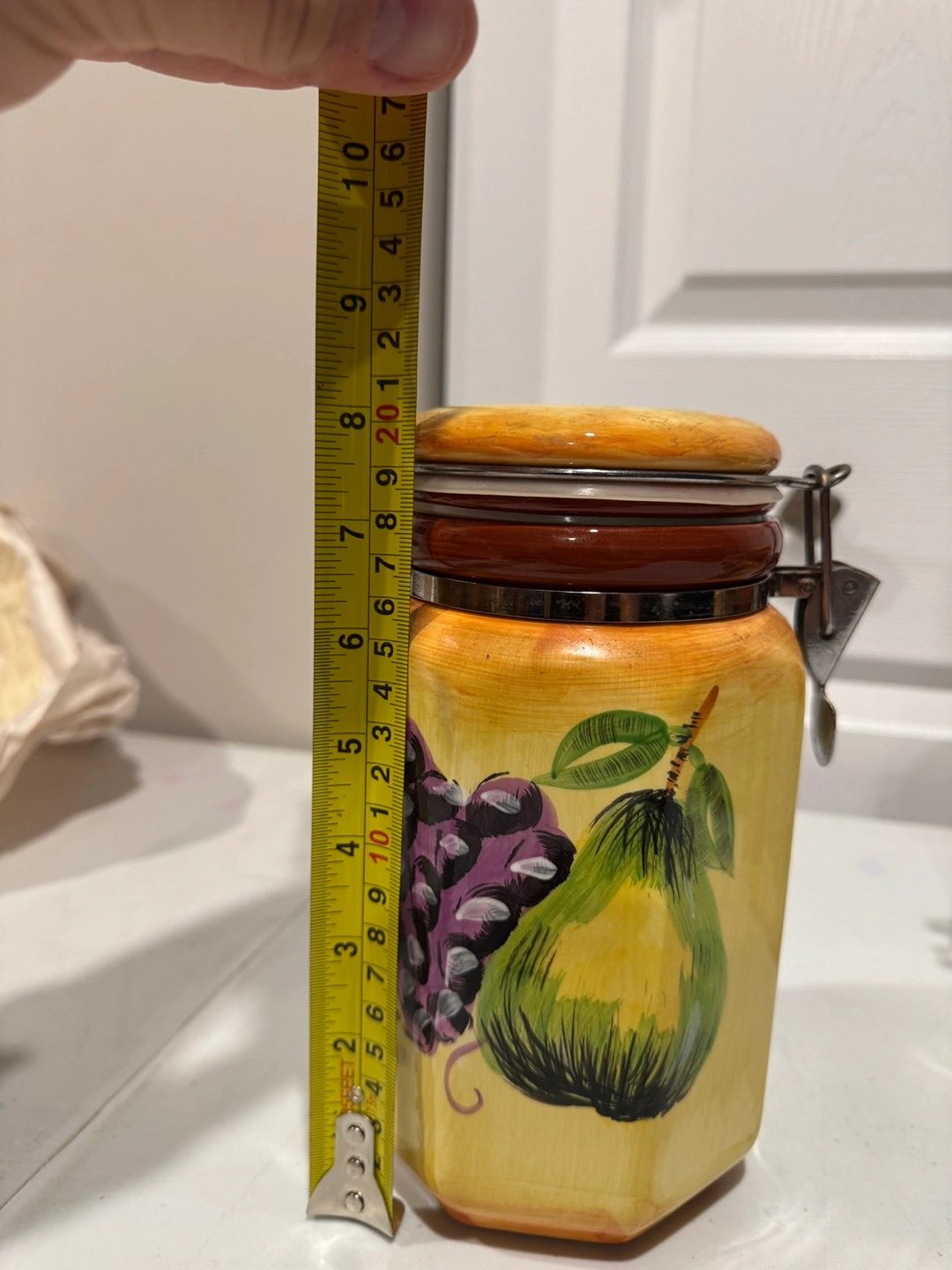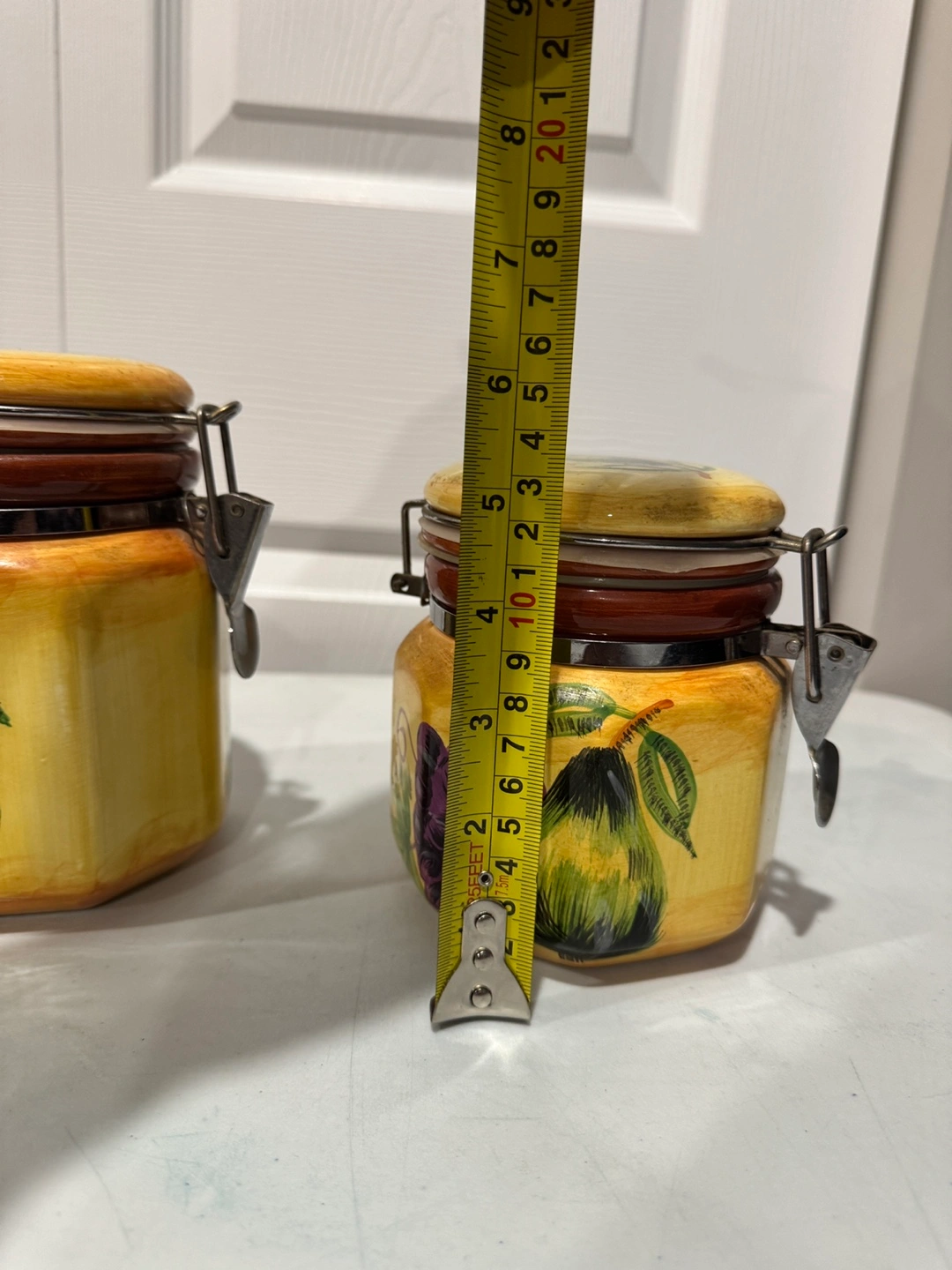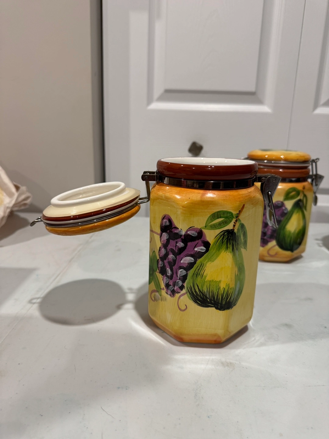 Four ceramic canisters, various sizes. Octagonal shape. Feature hand-painted design of pears and grapes. Metal clasp closures. Perfect for kitchen storage. Selling for $40 Located in st adolphe but can meet in south end of city