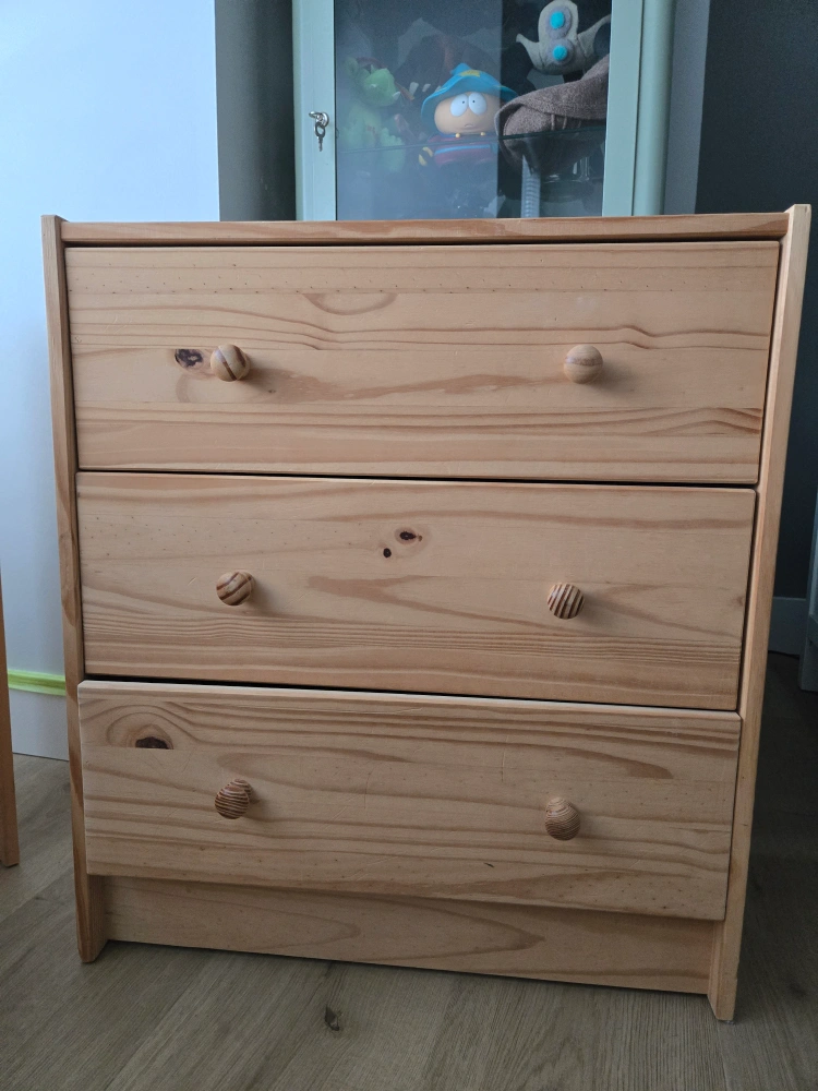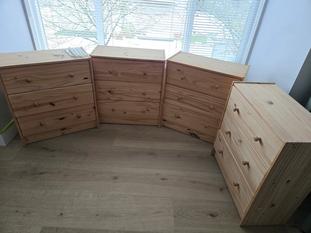 291Good used condition four Ikea Rast dressers. There are very minor usage marks (please see photo) as this is pine (softer wood) but nothing visible. Otherwise all drawers work perfectly. One dresser is white inside the drawers, other three brown (as per photos) Dimensions are in one of the photos. These are great for any DIY or as is. Currently Ikea cheeped out and adds only 1 knob per drawer. Price at Ikea per one is $100 before tax. Preference to sell all for $250 If single $80 per one Spare parts will be added for free when buying all or to whomever buys first. Cash preference over e-transfer Pickup Langley 72/200