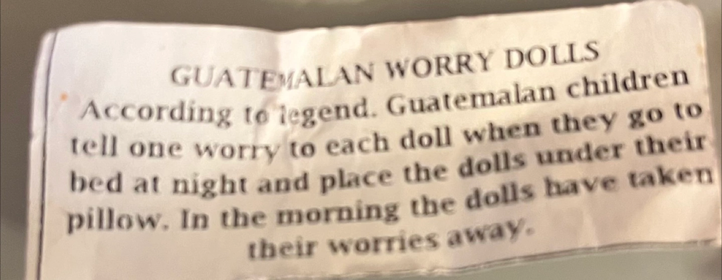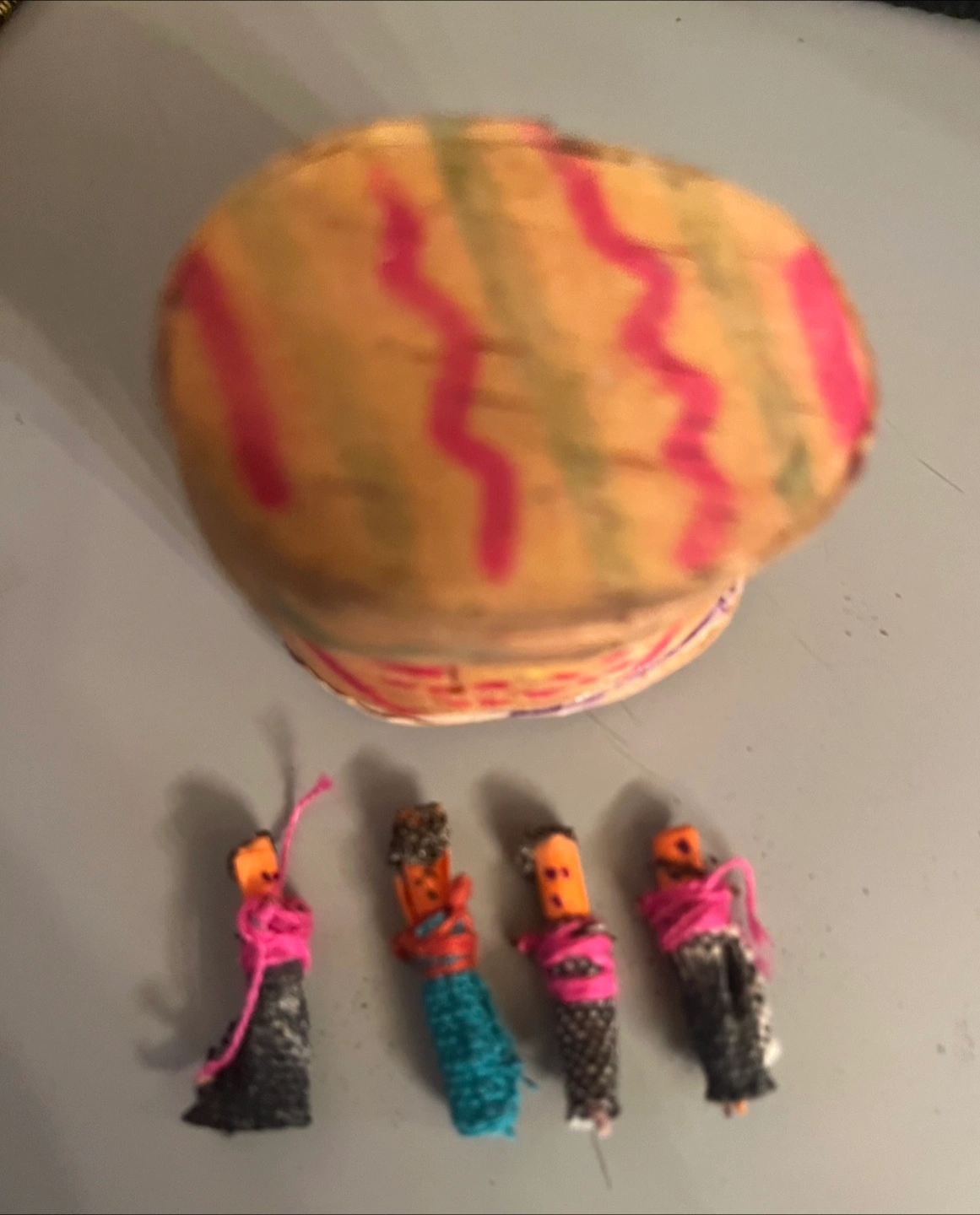 58Four small Guatemalan worry dolls. Unique handmade design. Come in a small container. Perfect gift or keepsake.