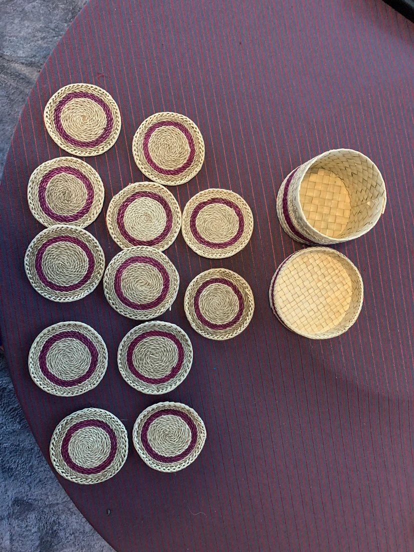 32Set of 12 woven coasters with a purple rim. Also includes a small woven storage container.