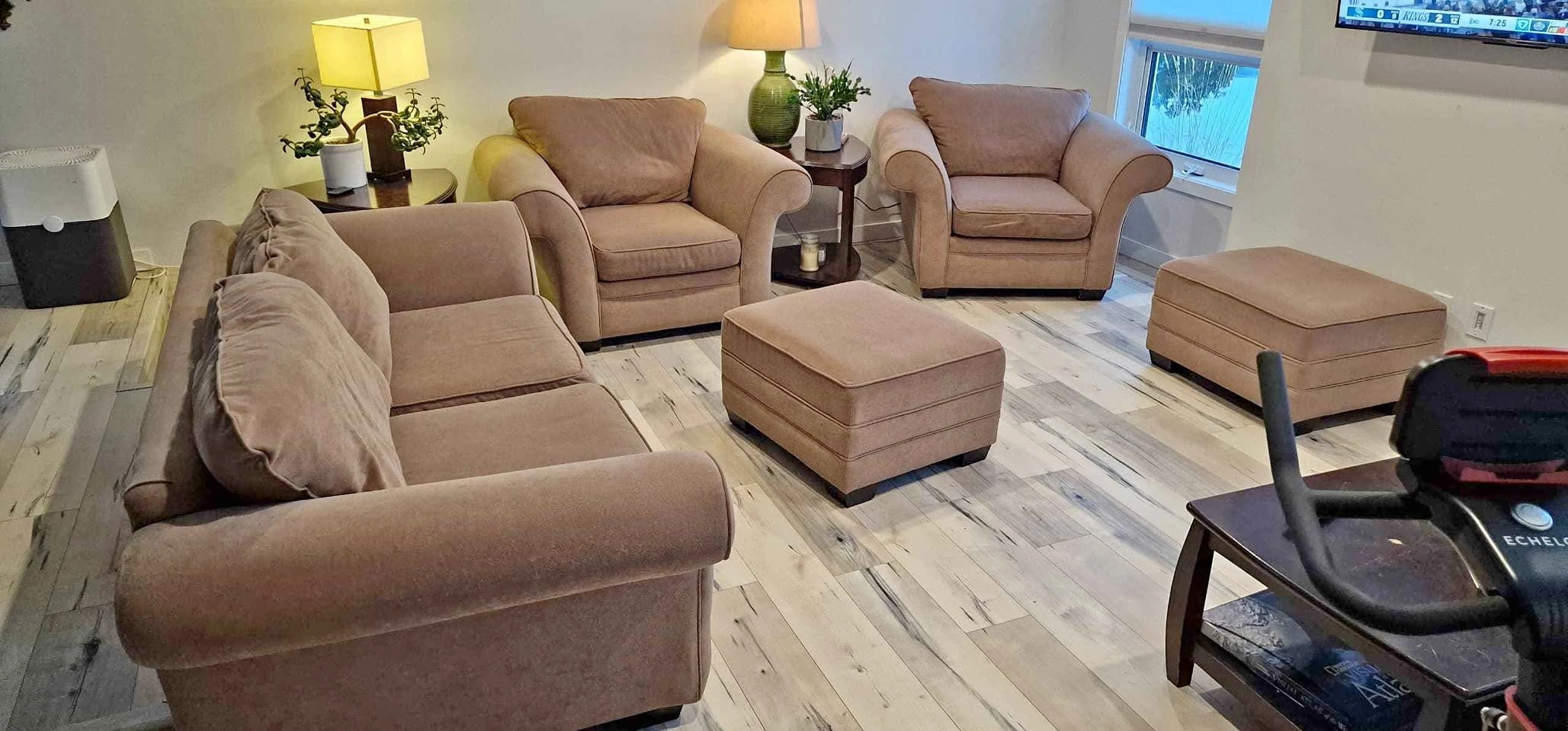 60Set of couch comprising of 1 Two seater, 2 one seaters and 2 Ottoman. Very sound and quality in a Pet free home. Pick up only.