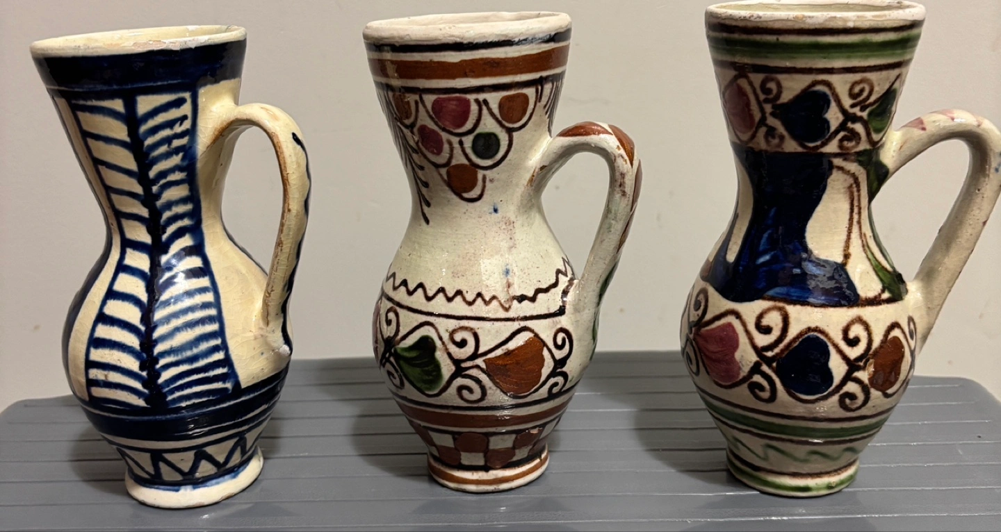 Set of three Hungarian Korond hand-painted ceramic jugs