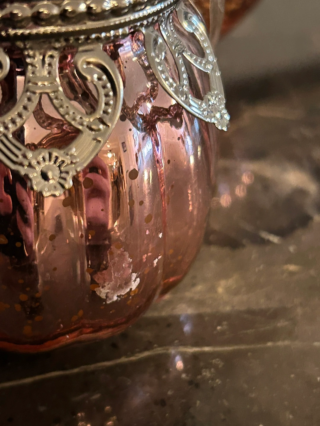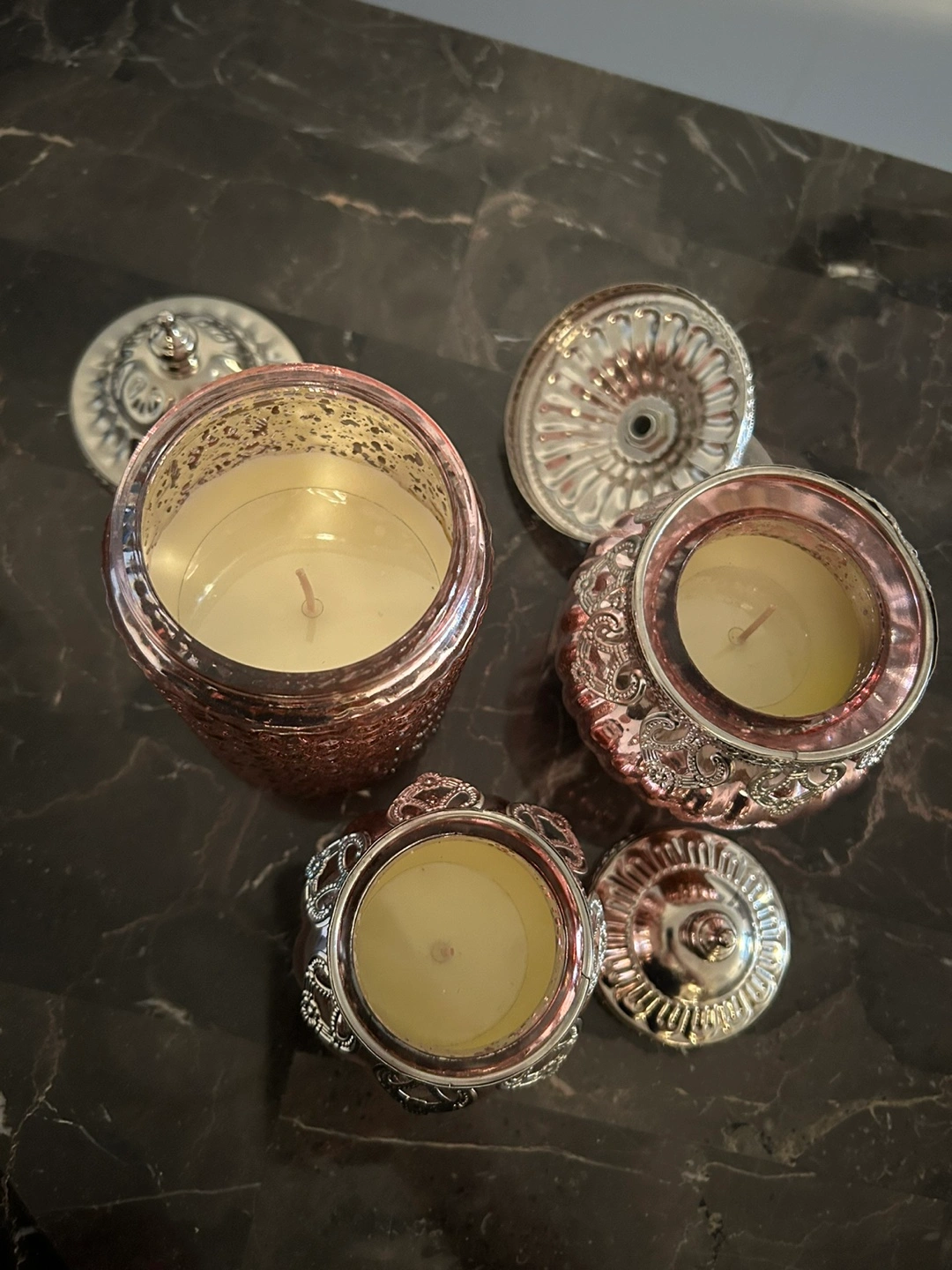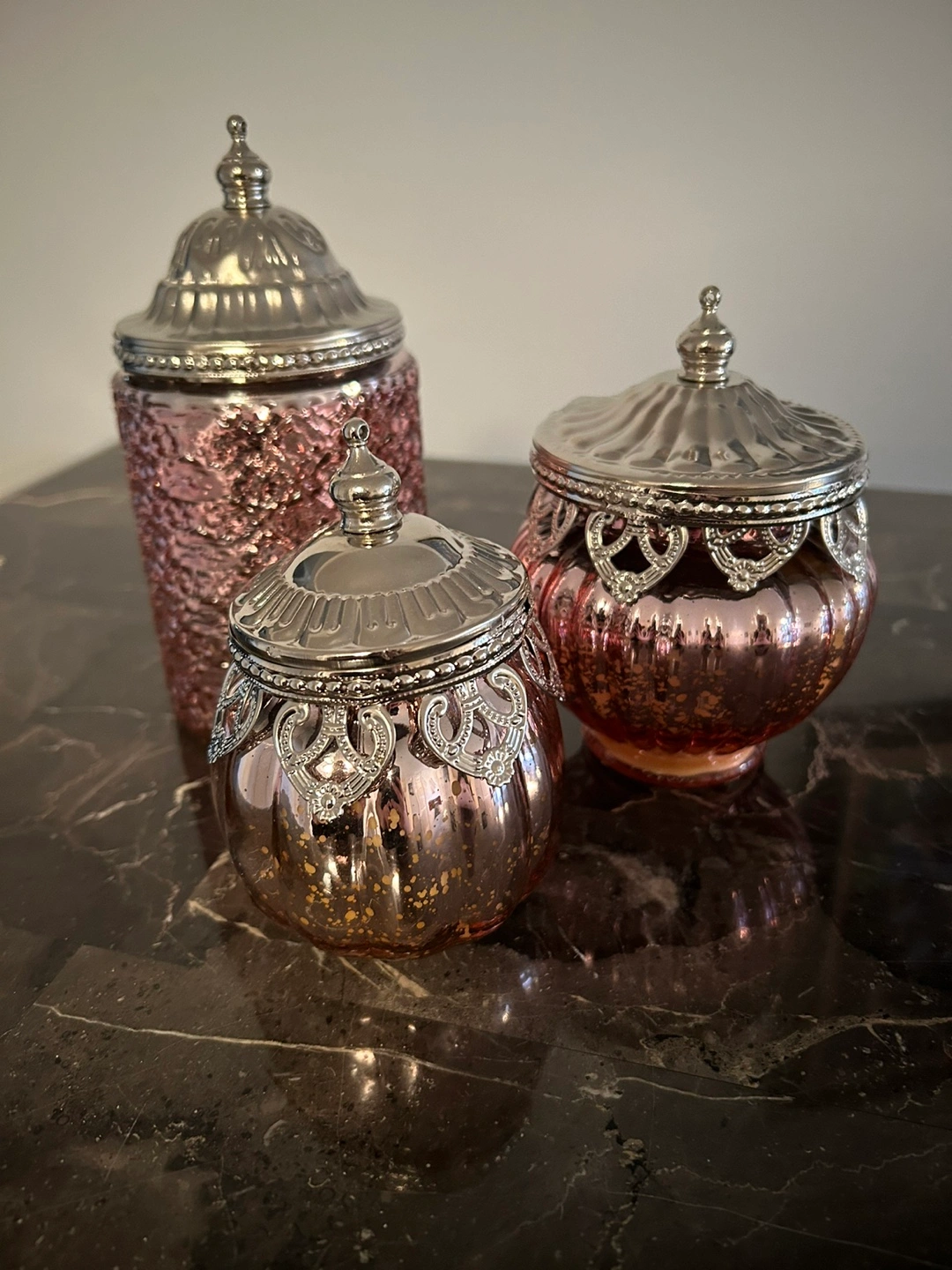 Beautiful set of three pink glass candle jars. Each jar features a unique shape and an ornate metal lid. Perfect for adding a touch of elegance to any room. Candles included. One candle has glue dot as it was part of a gift. Brand new, never used.