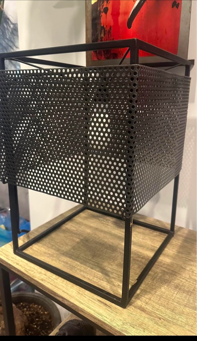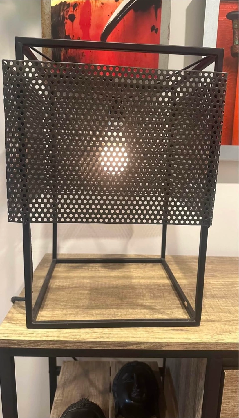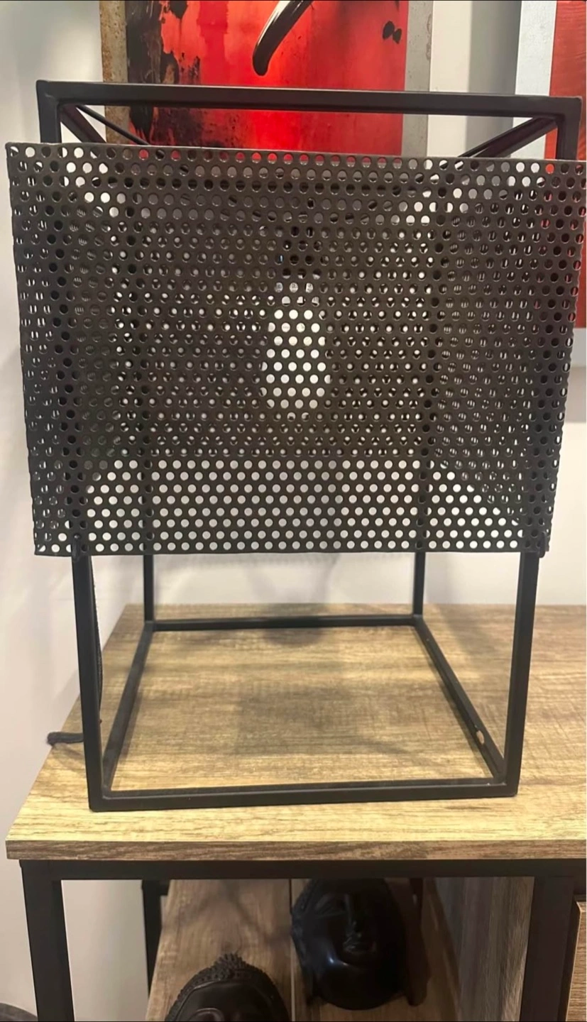 Here's a stylish black metal table lamp that would look great in any room! It has a unique perforated metal shade and a modern, minimalist design. It's in great condition and ready to brighten up your space