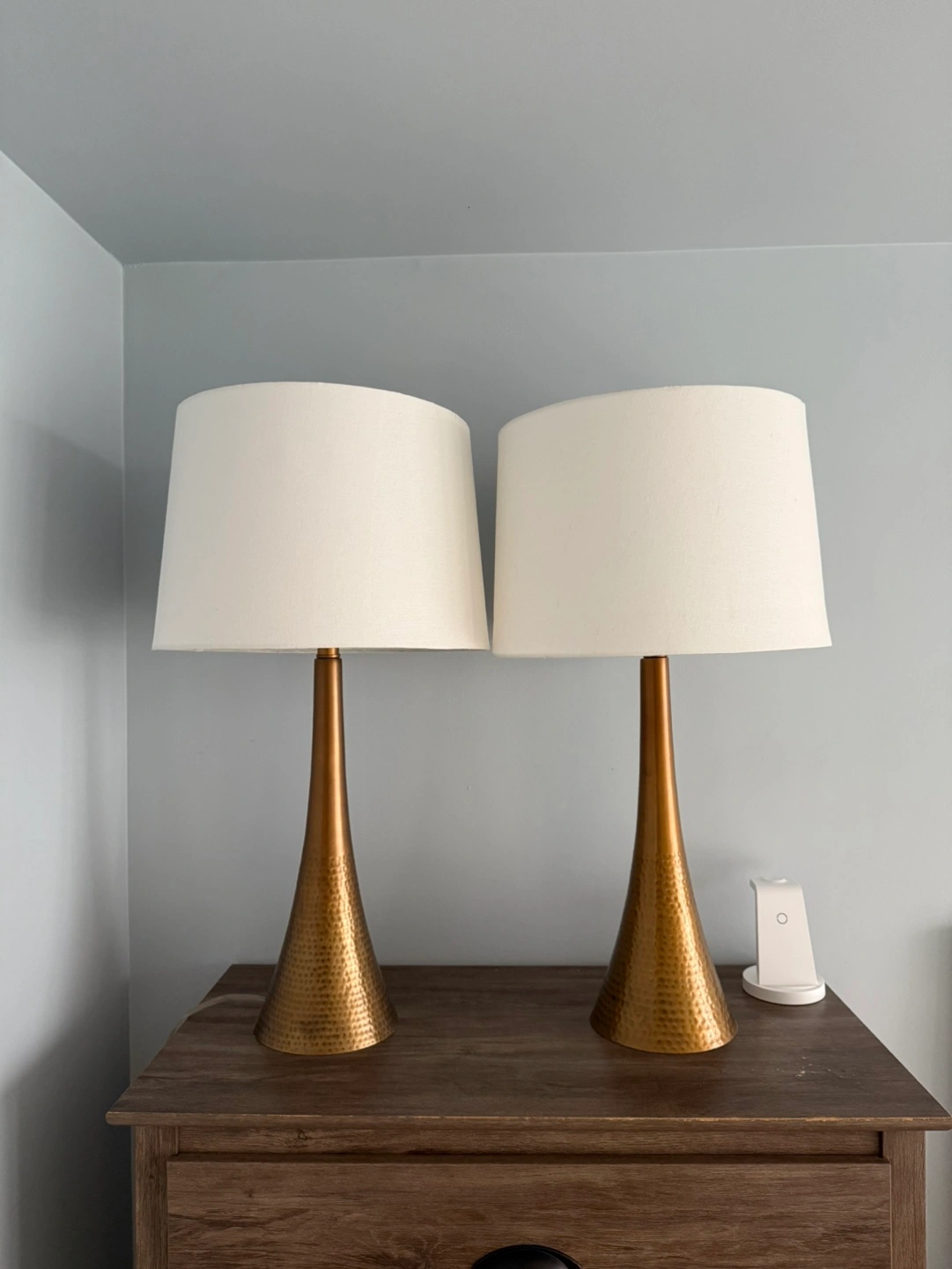 Set of two gold table lamps with white lampshades. Hammered metal finish.