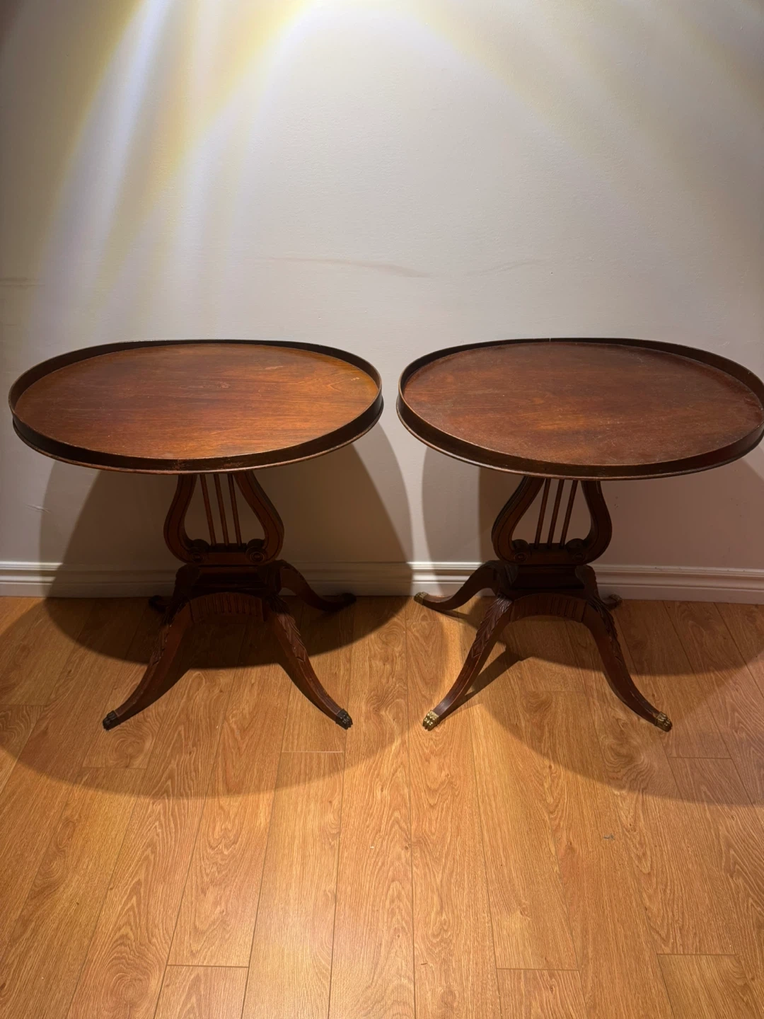 10Selling a set of two lovely vintage harp tables. These feature a unique lyre-shaped base and a classic round top. They would make a great addition to any living room or bedroom. There are some signs of wear consistent with age, but they're still in great shape!