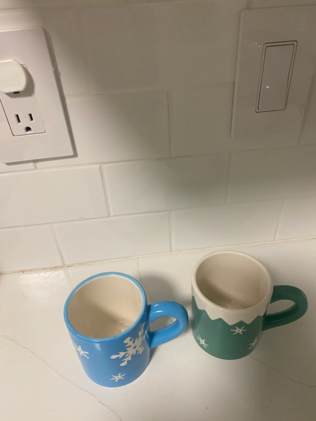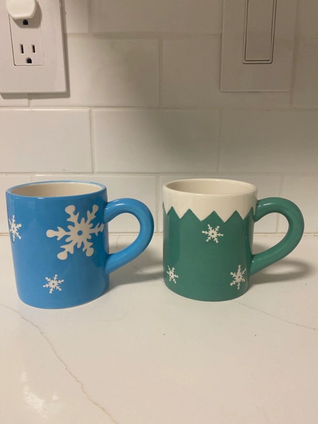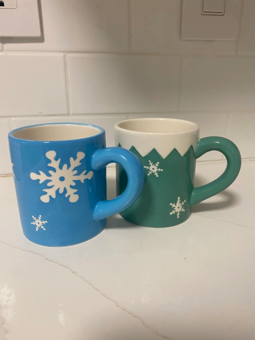 550Pair of ceramic mugs. Winter theme. Blue and green mugs. Snowflake design. Great for hot chocolate! New never used.