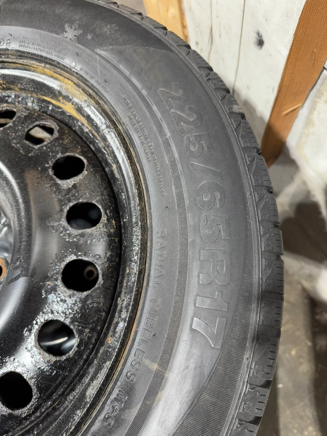 10Selling a set of winter tires, size 225/65R17. They are radial tubeless M+S tires. Ready to take on the Canadian winter!