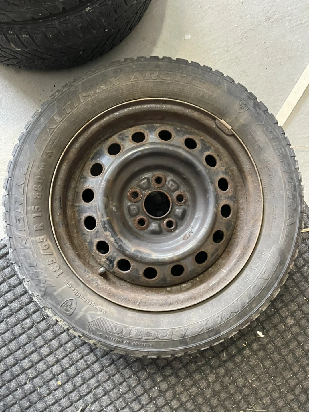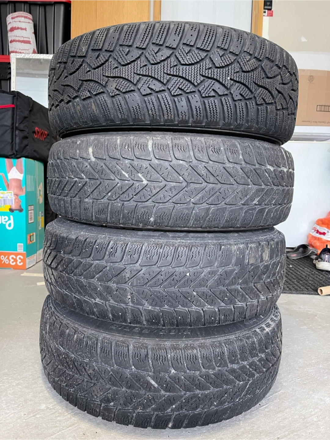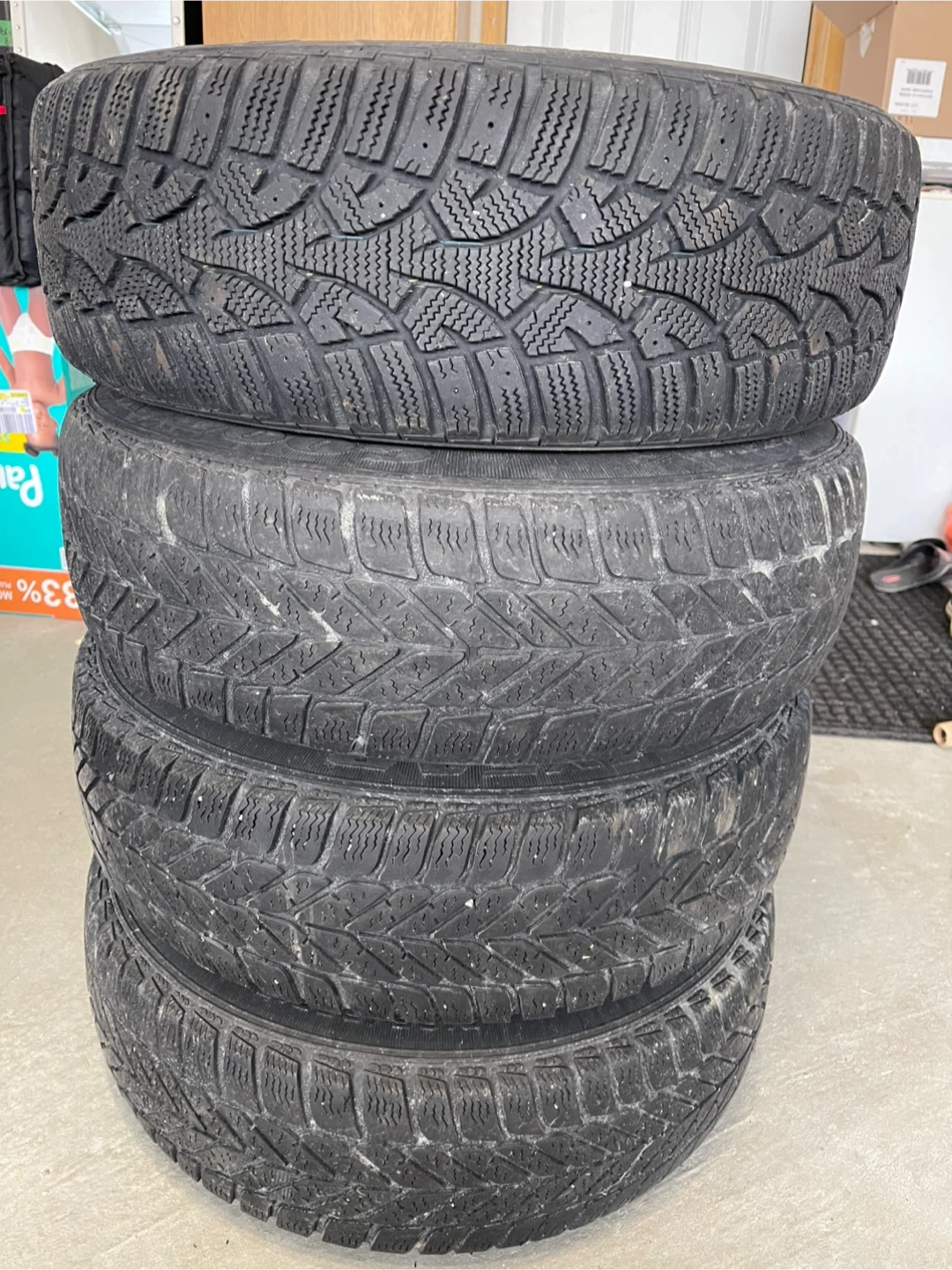10Selling a set of winter tires mounted on rims. They are used but still have some life left in them. The tires are a mix of Goodyear and Altimax Arctic. Ready to go for the winter season!