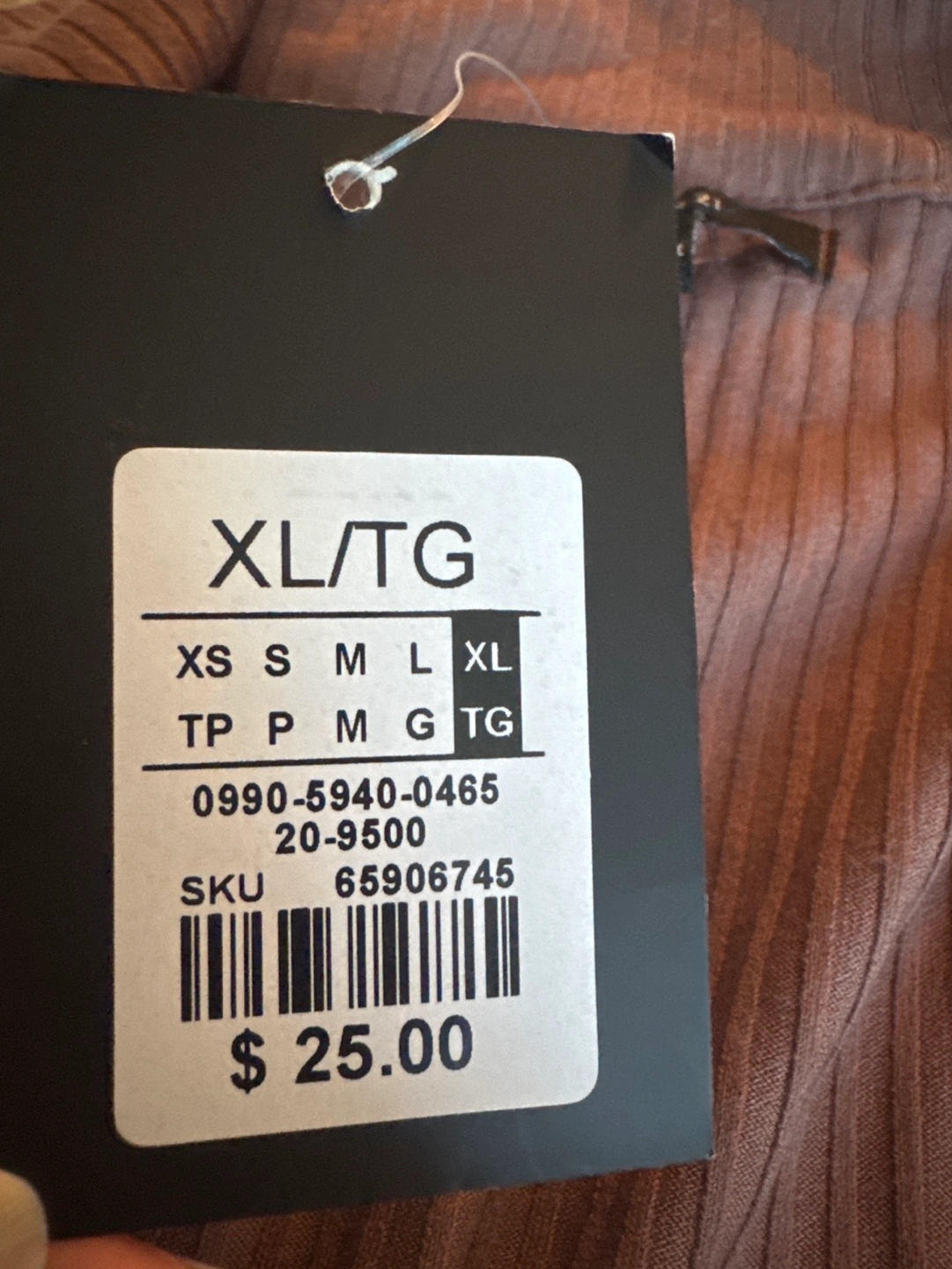 Mauve ribbed bodysuit. Long sleeves, collared neckline, and a tie at the waist. Size extra-large or tall.