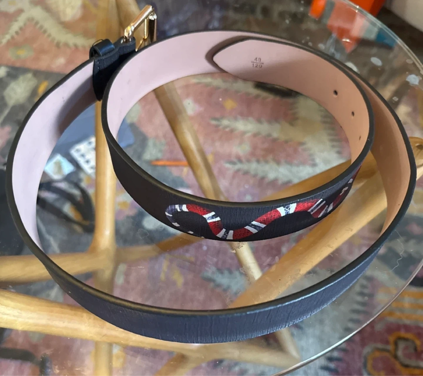 This is a black leather belt with the iconic Gucci snake motif. It features a gold-tone buckle. The belt is size is US mens 34-36 and measures 120cm in length. Is in like new condition and only worn twice, only 1 owner.