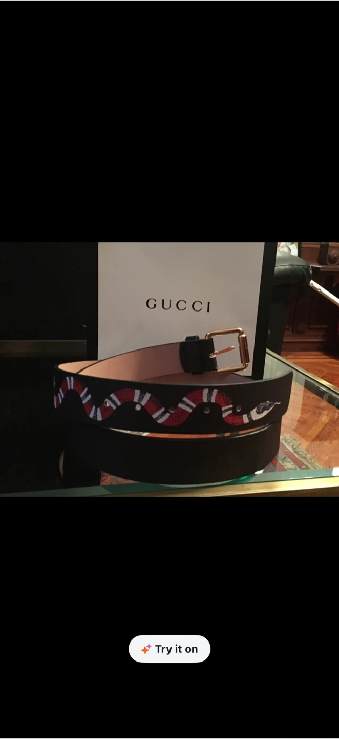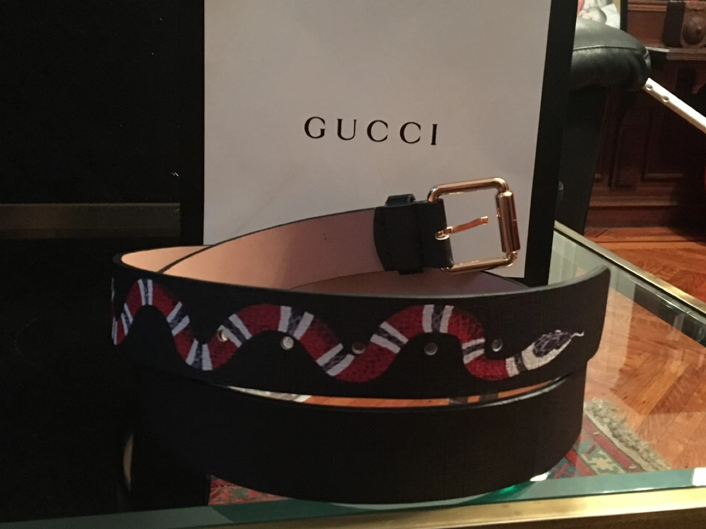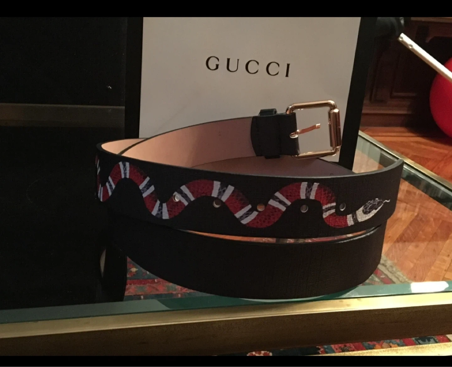 This is a black leather belt with the iconic Gucci snake motif. It features a gold-tone buckle. The belt is size is US mens 34-36 and measures 120cm in length. Is in like new condition and only worn twice, only 1 owner.