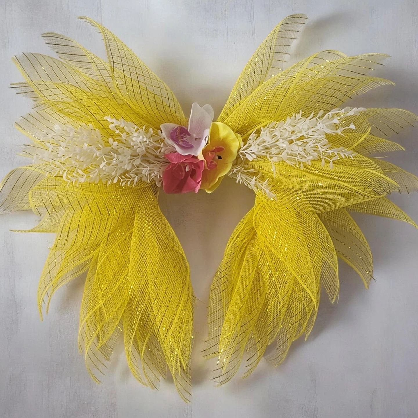 Bright yellow Angel wings with artificial flowers. It's made of mesh material with glitter accents. This accent piece would add a pop of colour to any space!