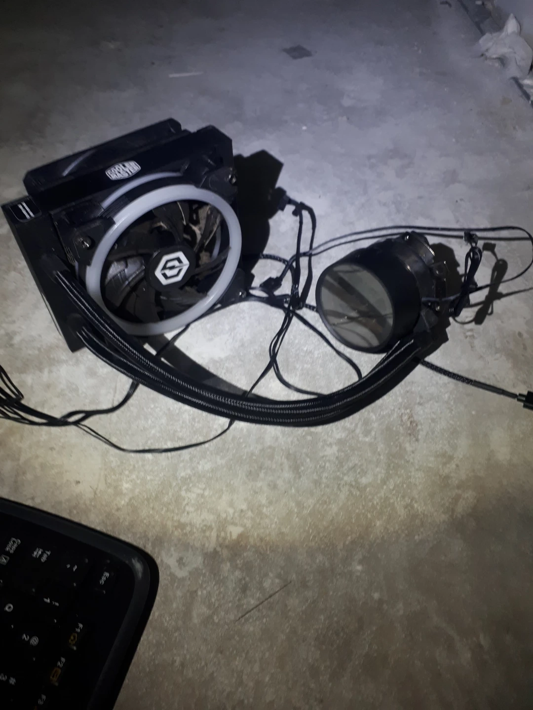 This is a Cooler Master MasterLiquid 240 all-in-one CPU cooler. It features a black radiator with white LED lighting on the fan. The pump block is circular with a black housing. Tubing is braided black. It's designed for efficient cooling of computer processors. This would be useful for PC builders looking for a liquid cooling solution.