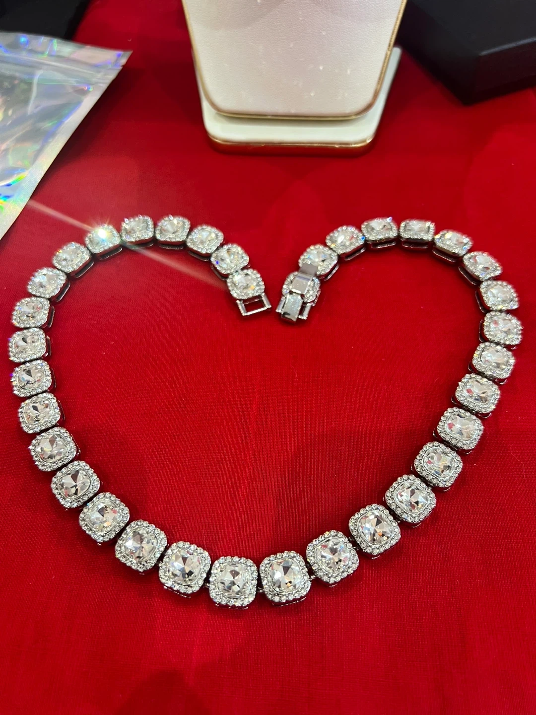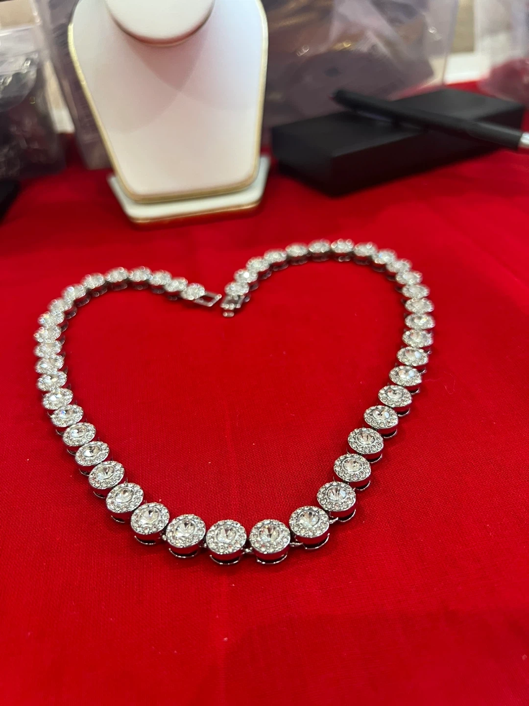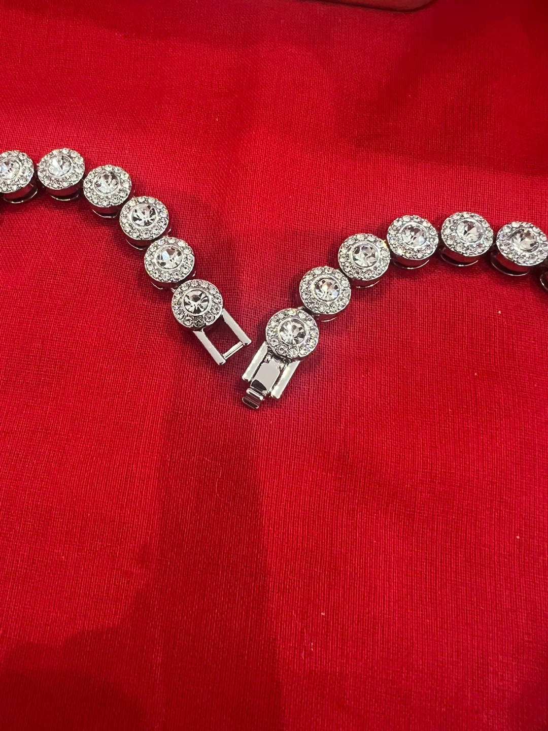 This elegant tennis necklace features a row of sparkling clear crystals. It's designed with a secure clasp closure for comfortable wear. This necklace is perfect for adding a touch of glamour to any outfit!