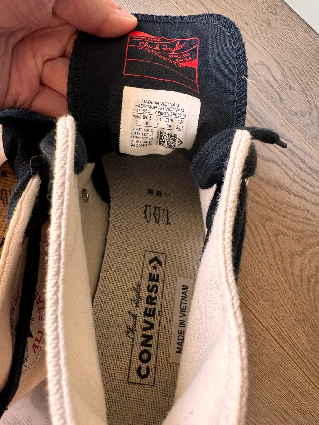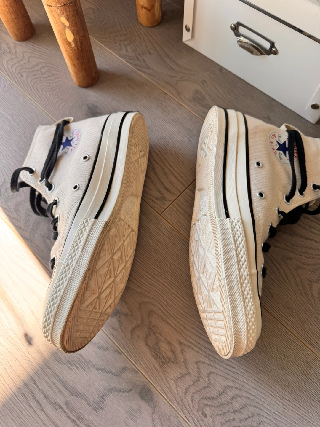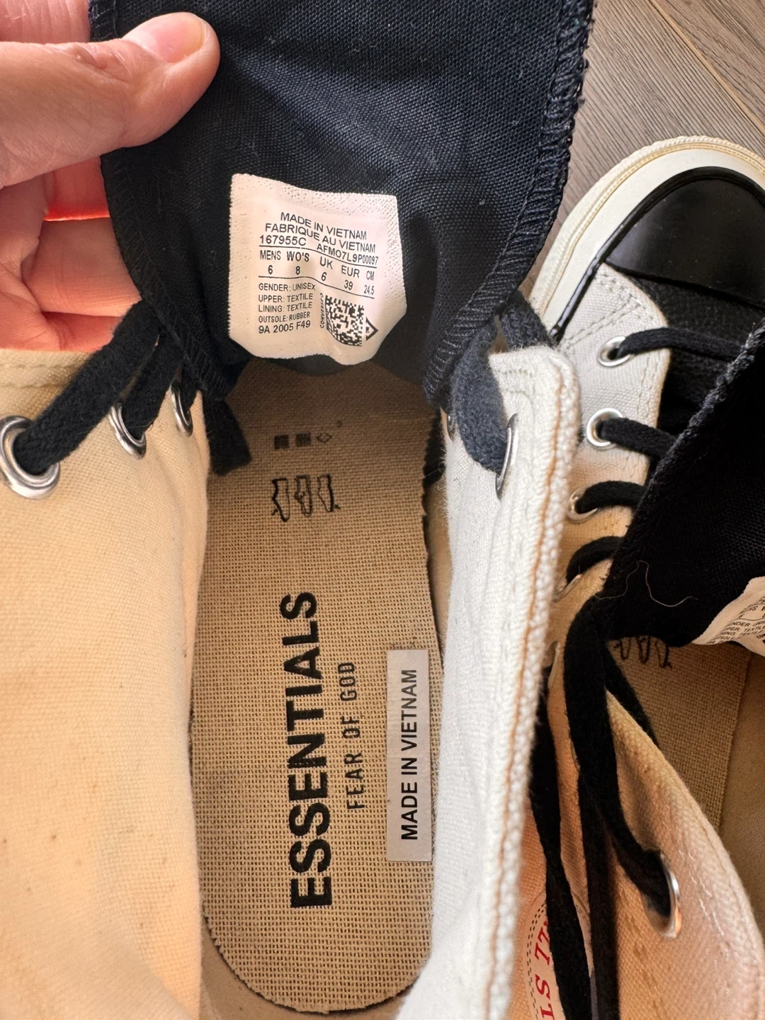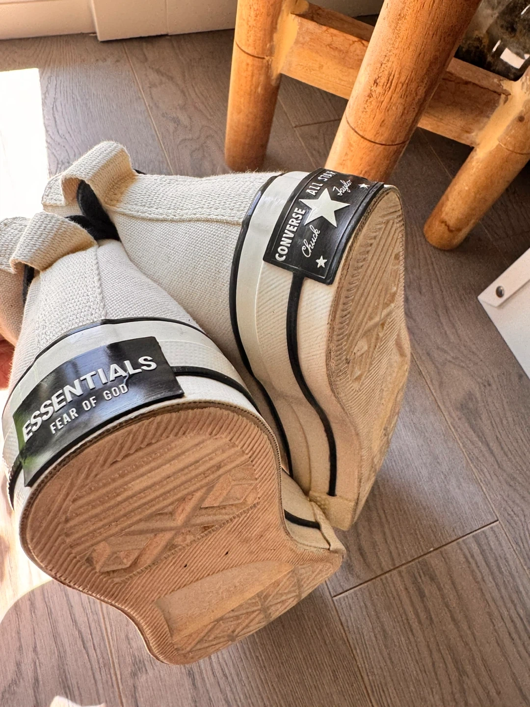 Cream canvas high-top sneakers with black accents. Features collaboration branding with Fear of God Essentials. Classic Chuck Taylor sole.