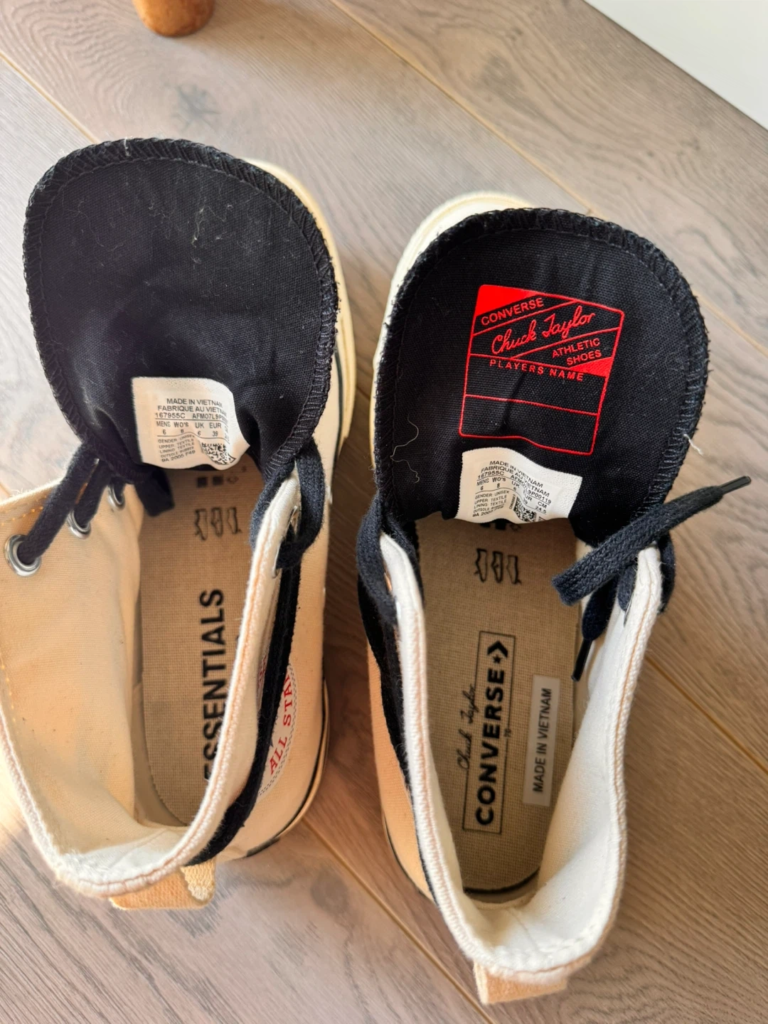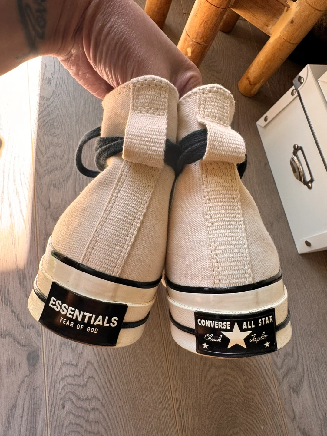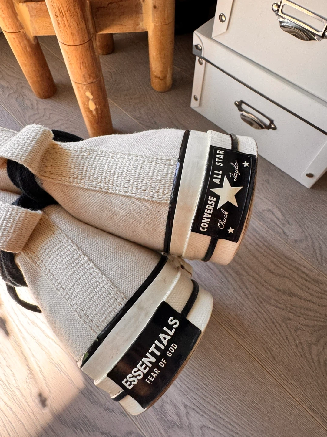 Cream canvas high-top sneakers with black accents. Features collaboration branding with Fear of God Essentials. Classic Chuck Taylor sole.