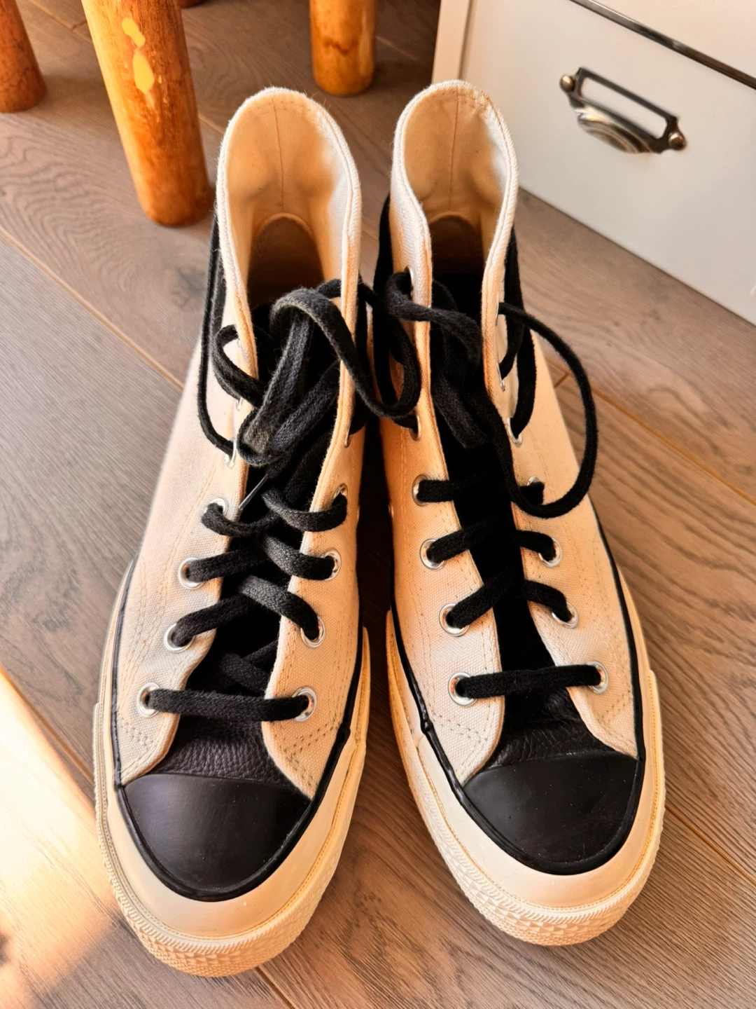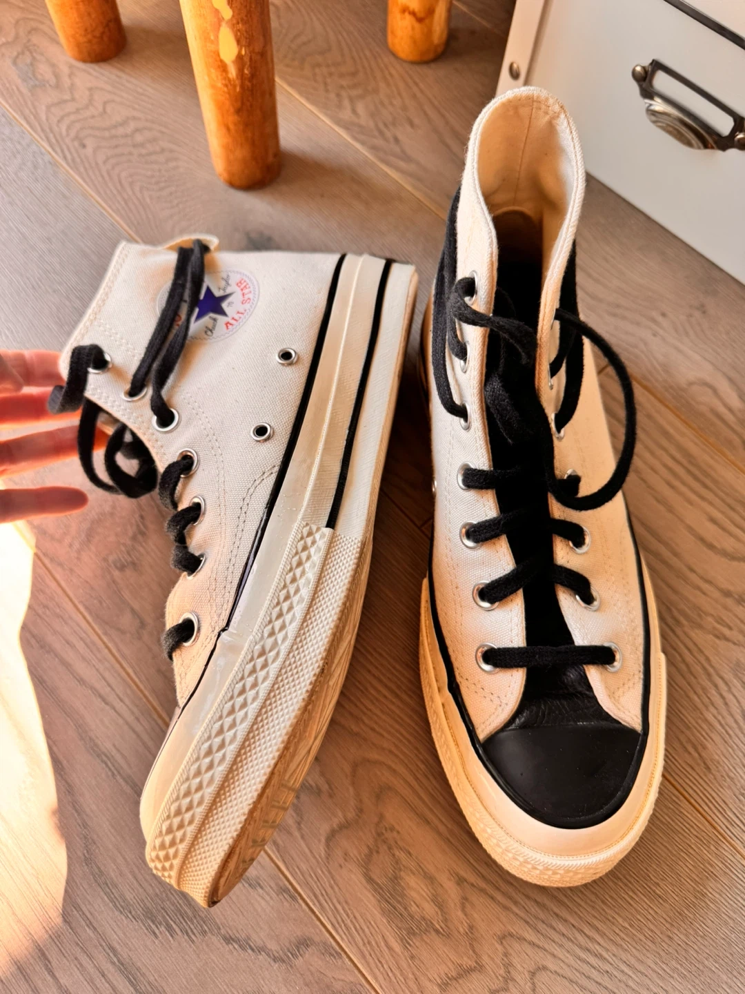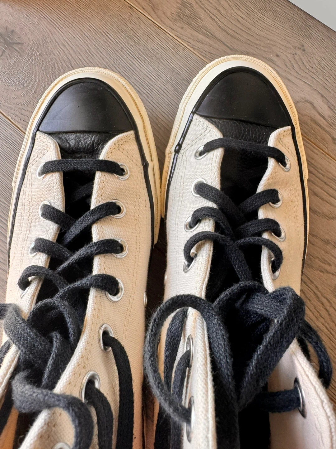 Cream canvas high-top sneakers with black accents. Features collaboration branding with Fear of God Essentials. Classic Chuck Taylor sole.