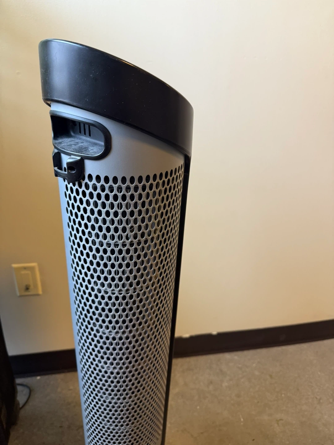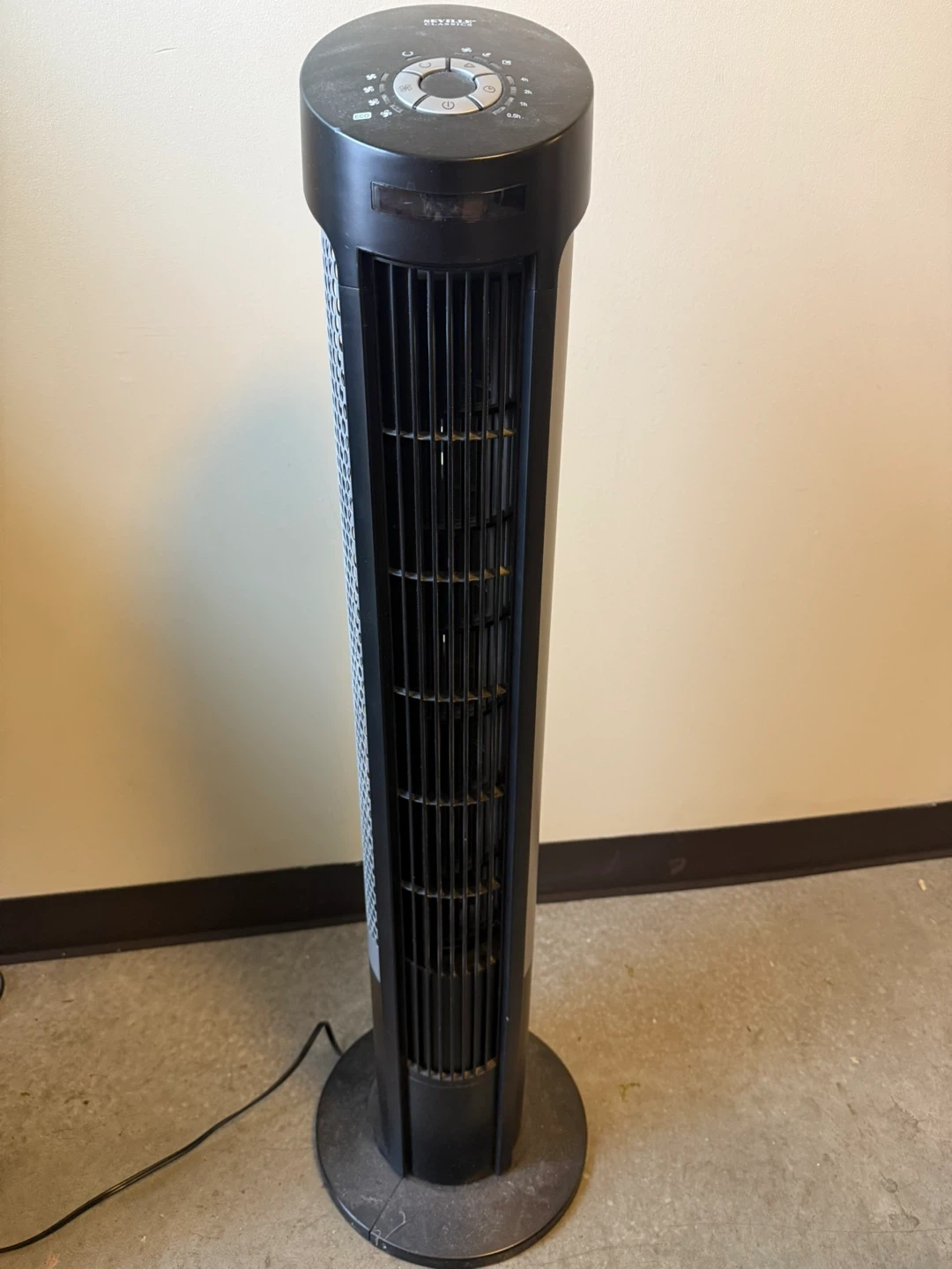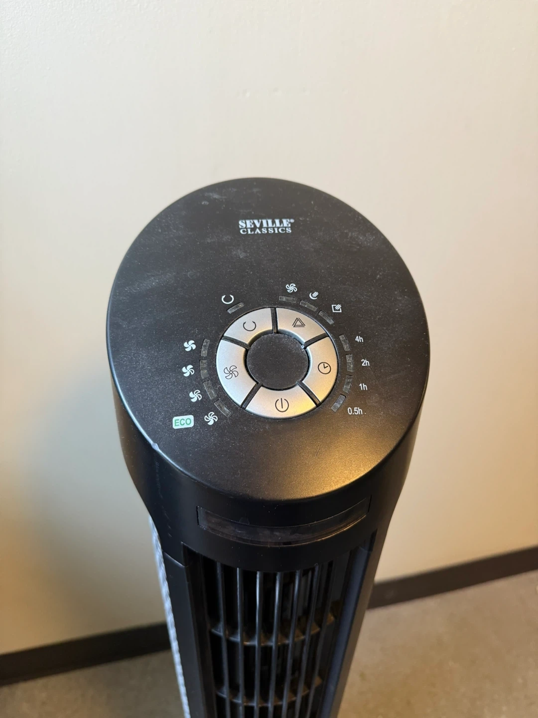 Selling a Seville Classics tower fan. It has a black top and a silver body with a perforated design. It features multiple speed settings and a timer function for convenient use