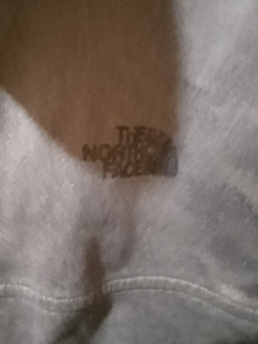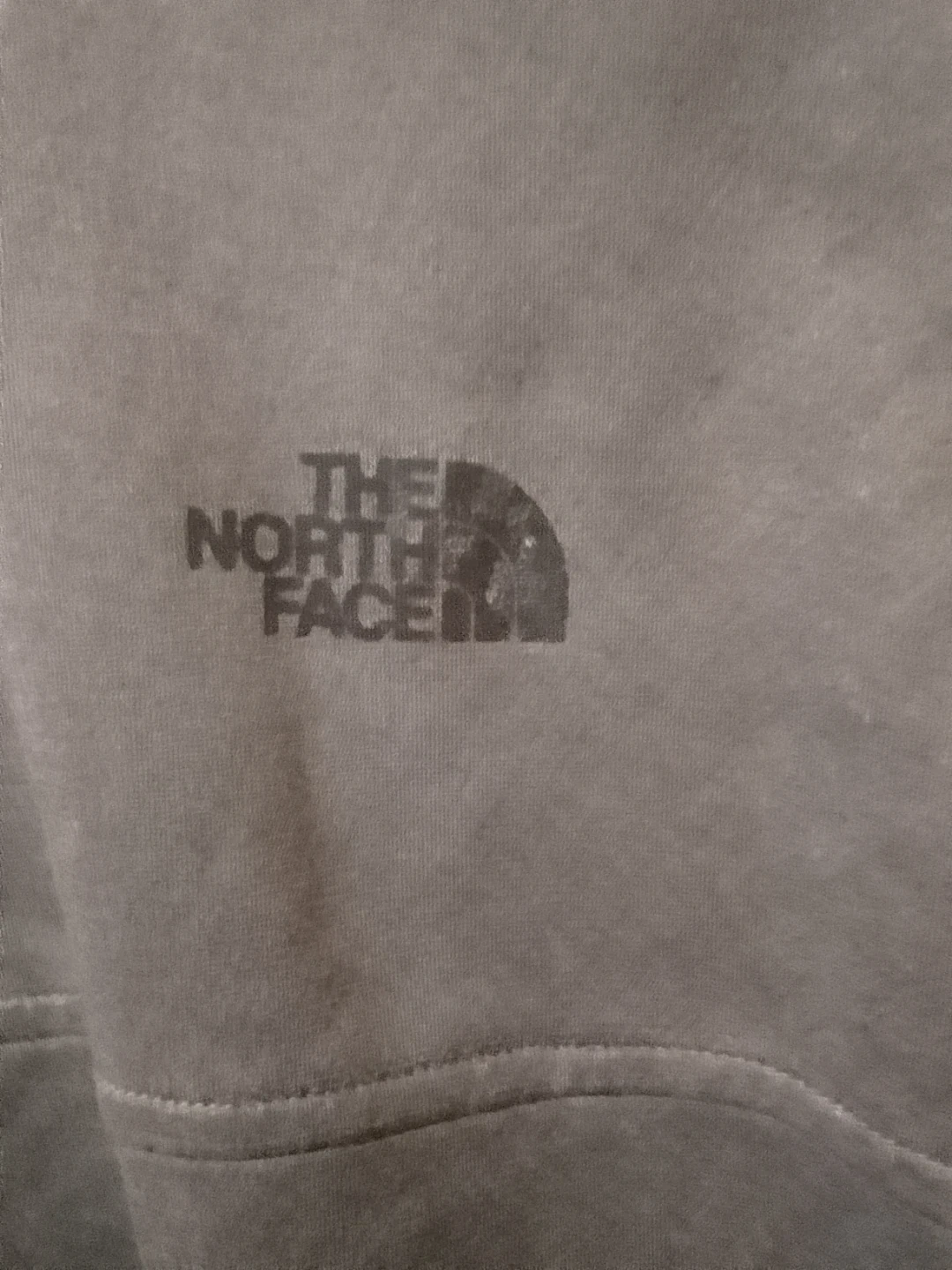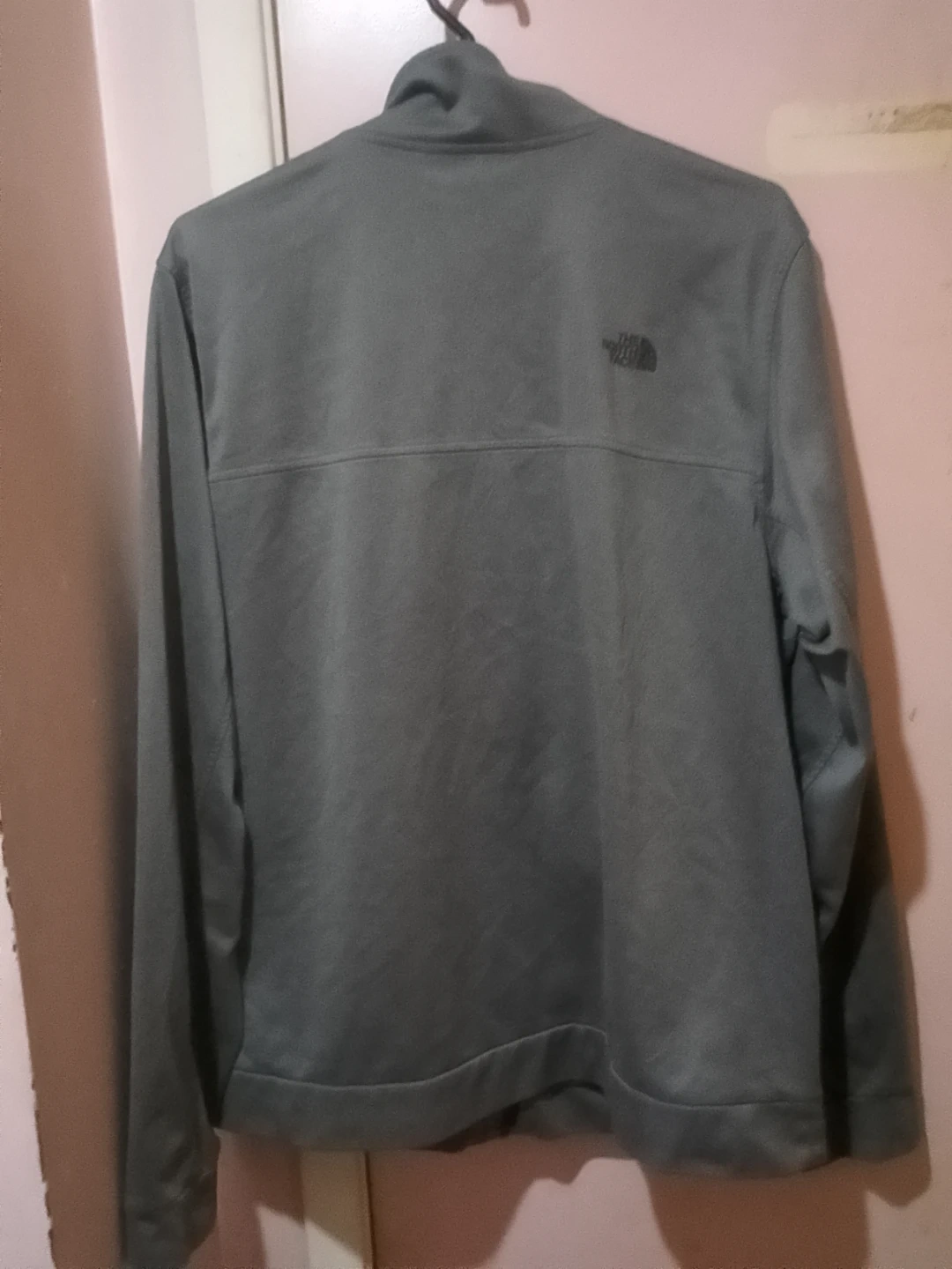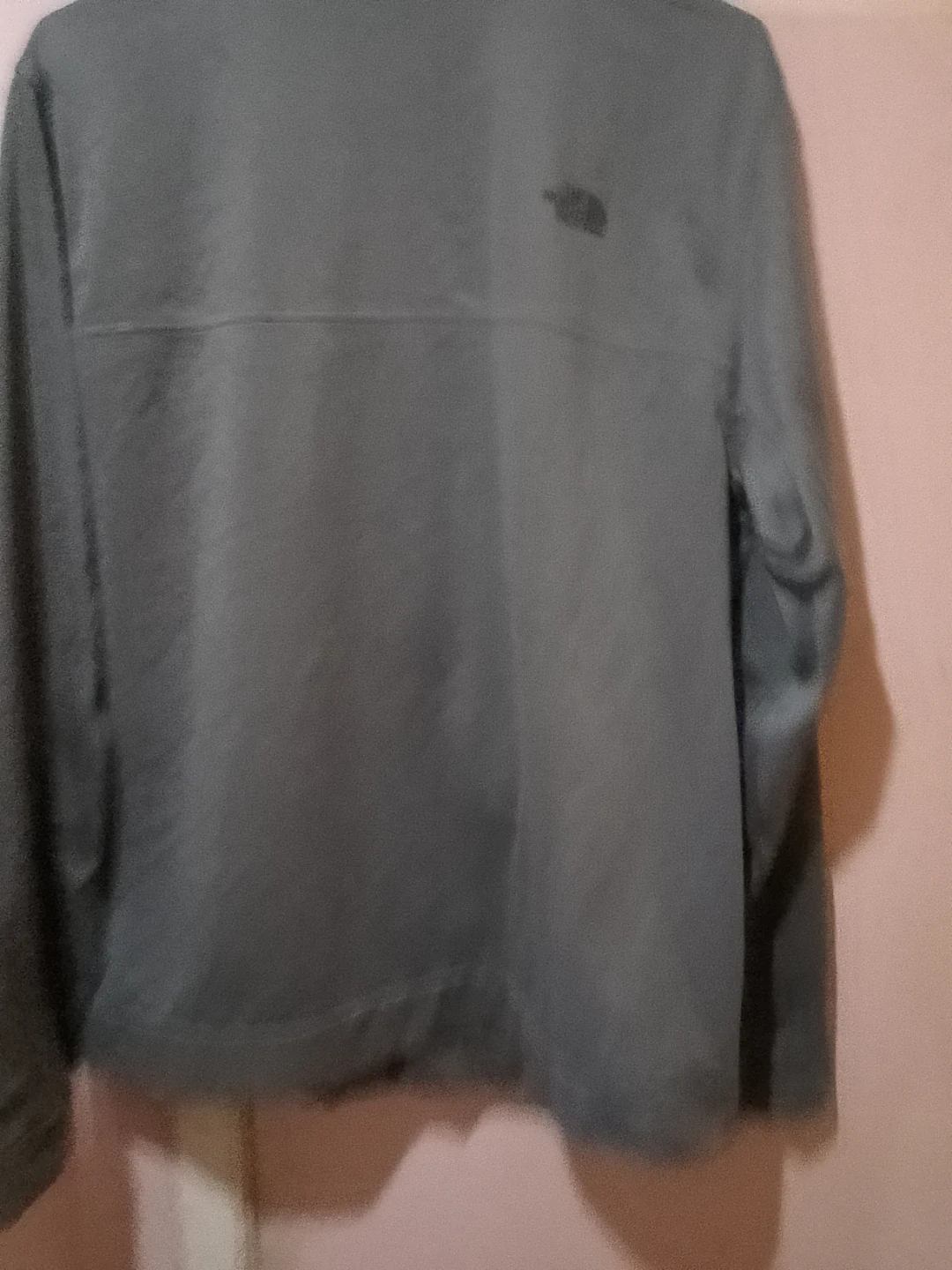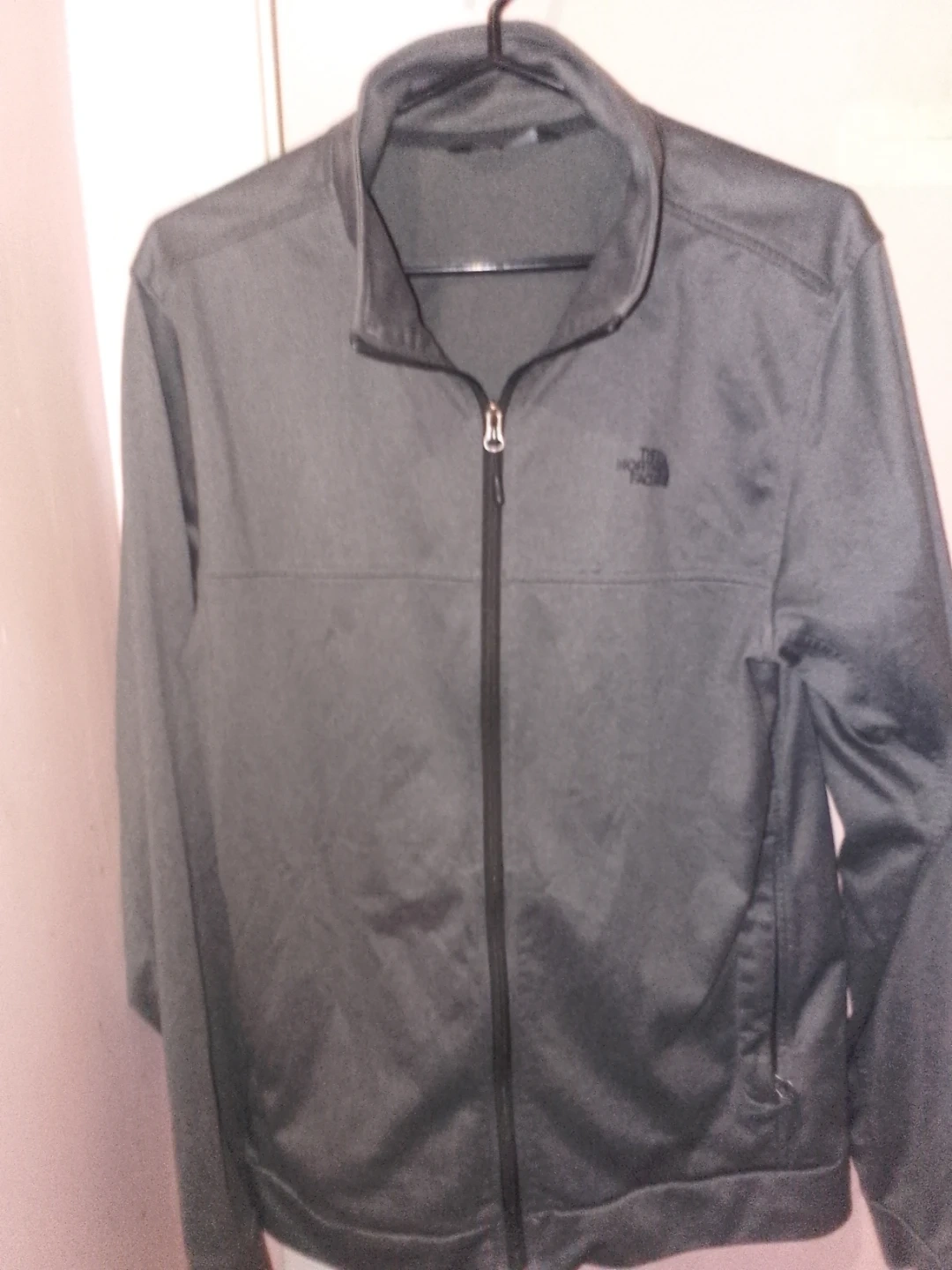 This is North Face men's full-zip jacket. It features a zipper closure and two inside pockets. It's a grey colour. Mens Large