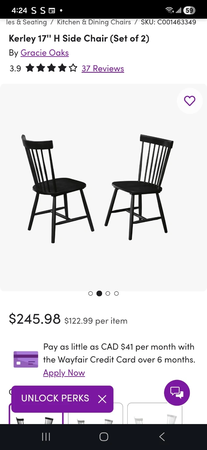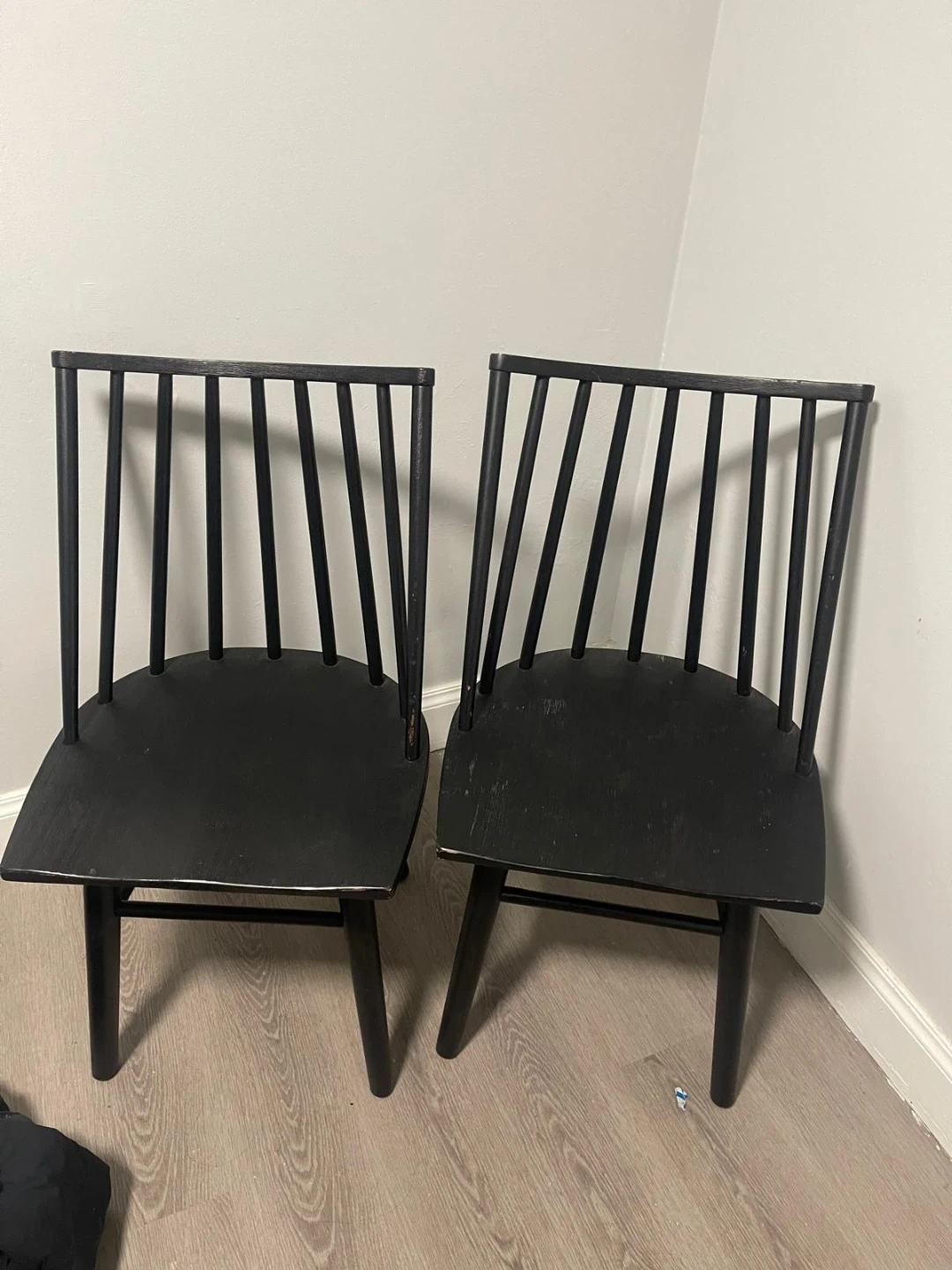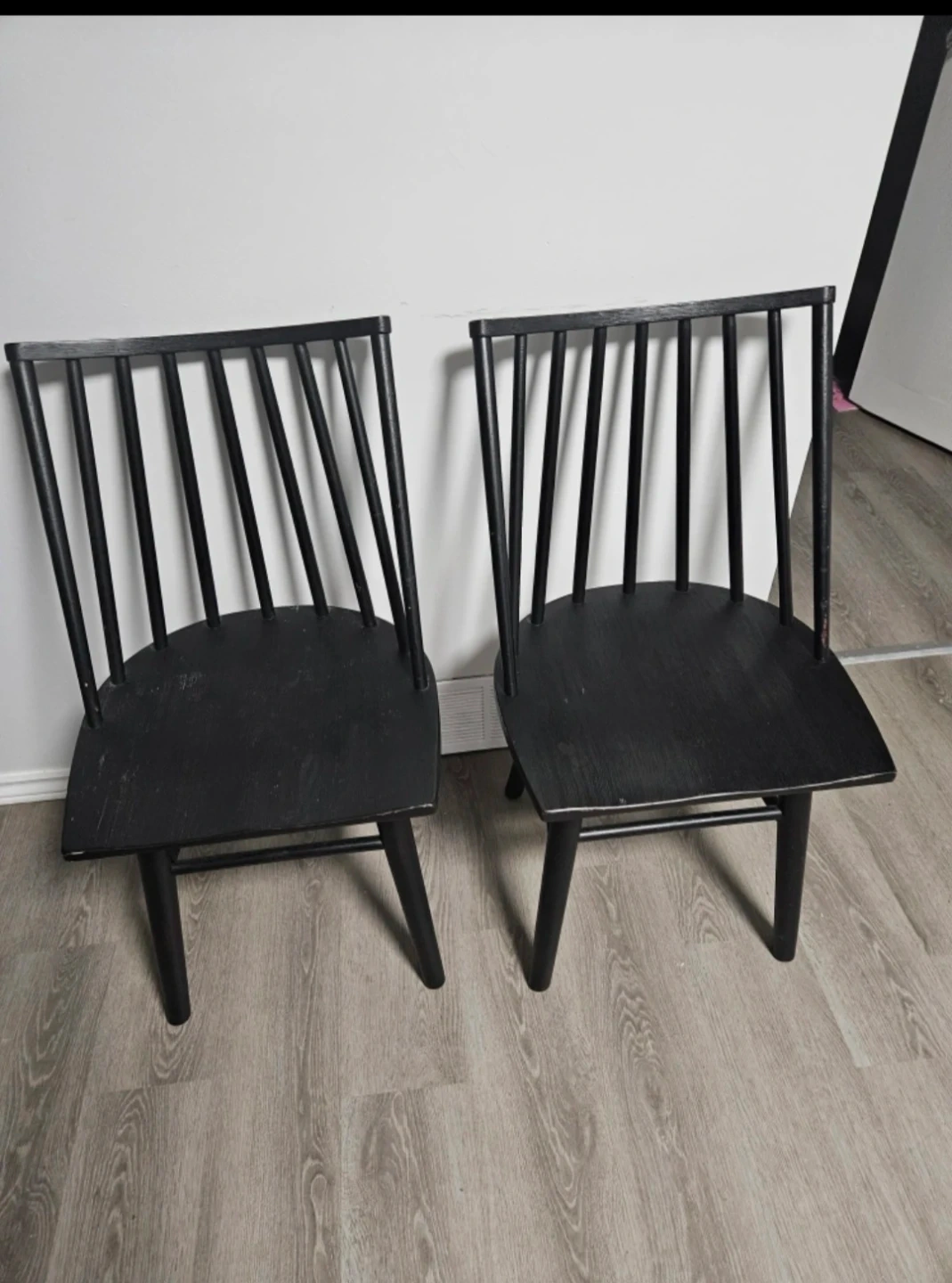 Selling a set of two black side chairs. These chairs have a spindle back design and wooden seats. They're suitable for dining areas or as accent chairs.